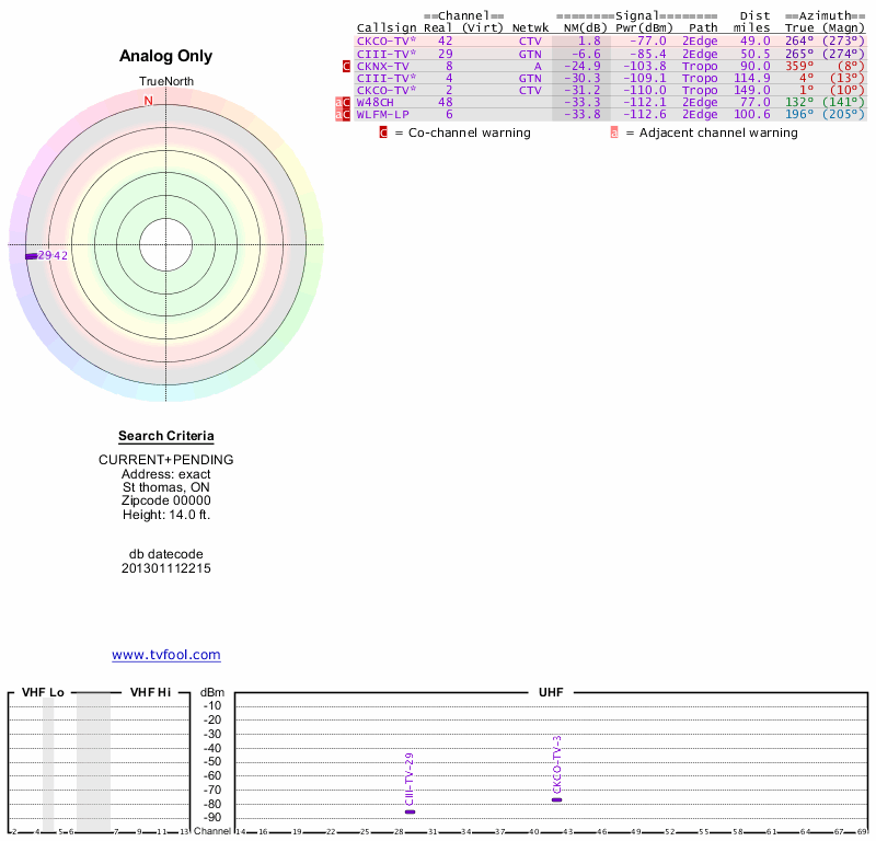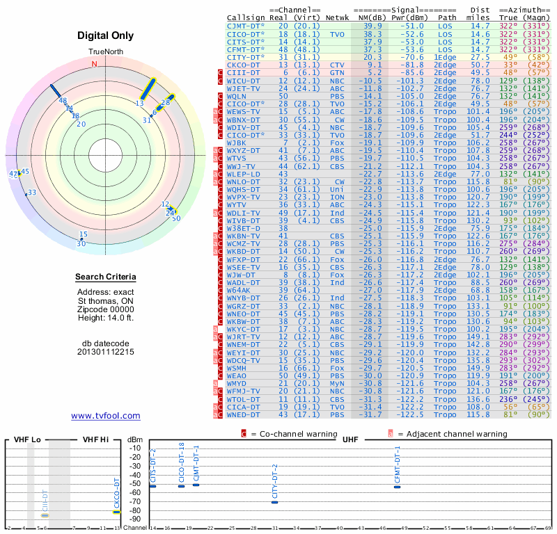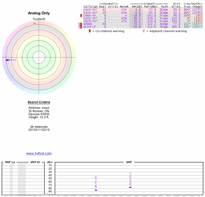 Here are the results for your location. The transmitter database was last updated on June 7, 2013. For more information about these plots and how to interpret them, please check out the Signal Analysis FAQ.