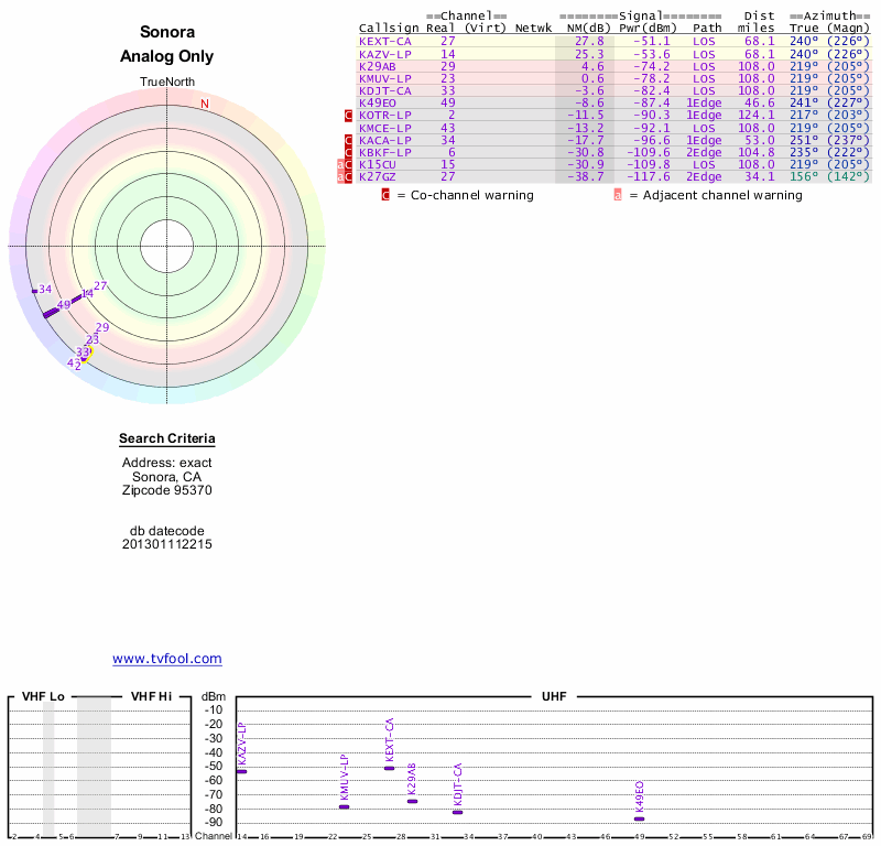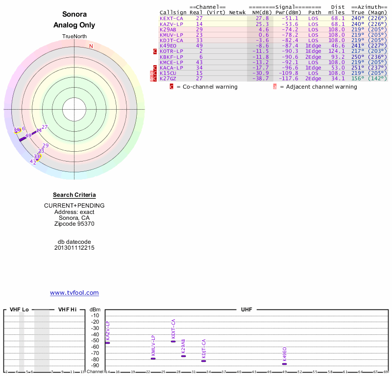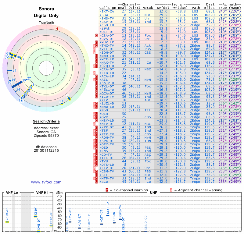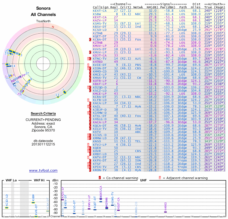 Here are the results for your location. The transmitter database was last updated on June 7, 2013. For more information about these plots and how to interpret them, please check out the Signal Analysis FAQ.