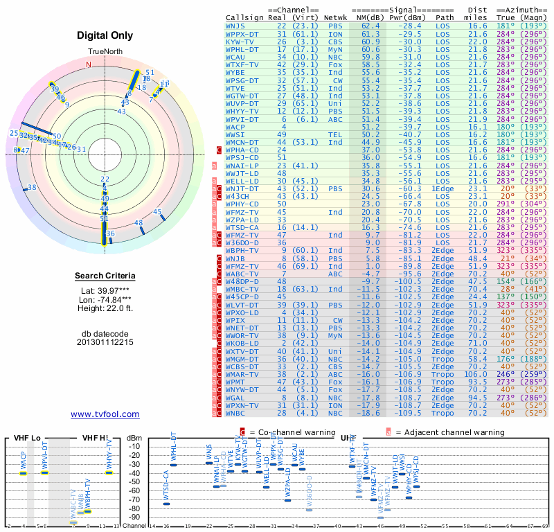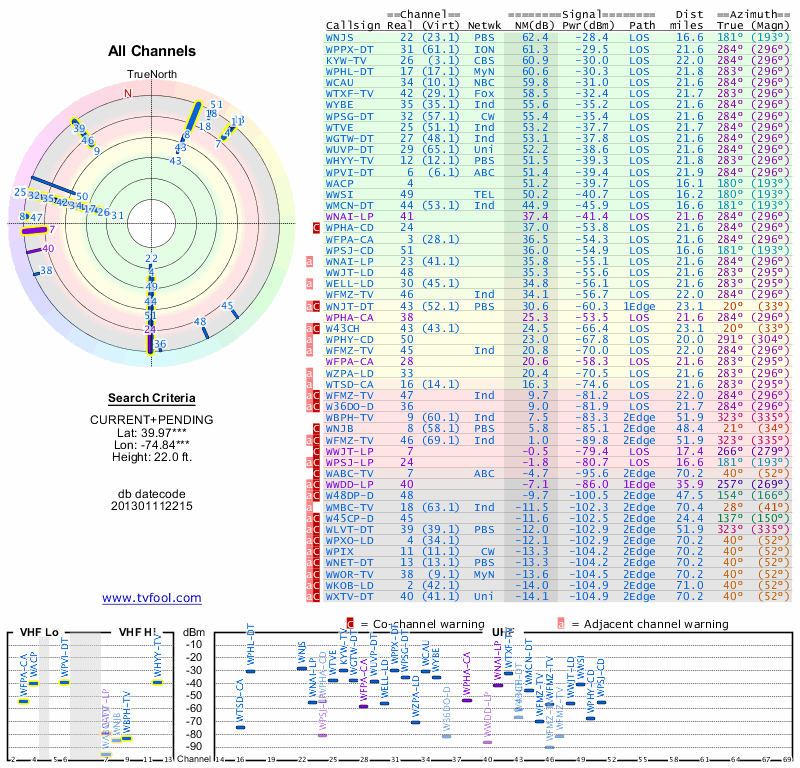 Here are the results for your location. The transmitter database was last updated on June 7, 2013. For more information about these plots and how to interpret them, please check out the Signal Analysis FAQ.