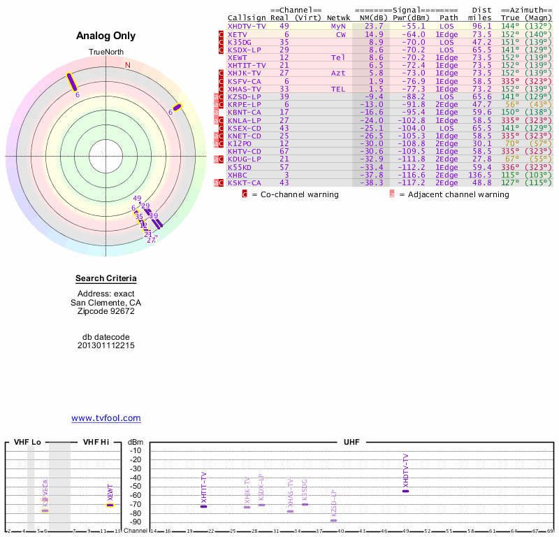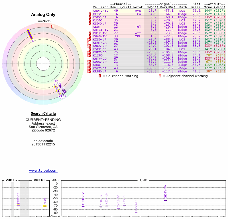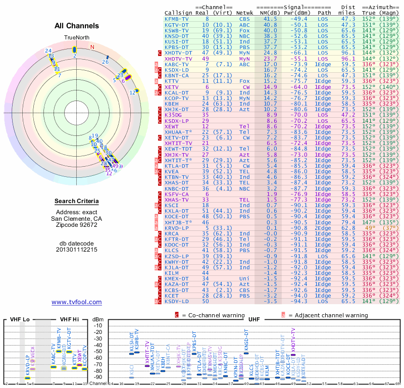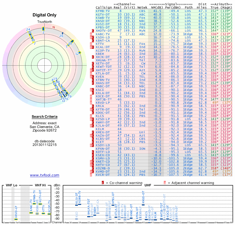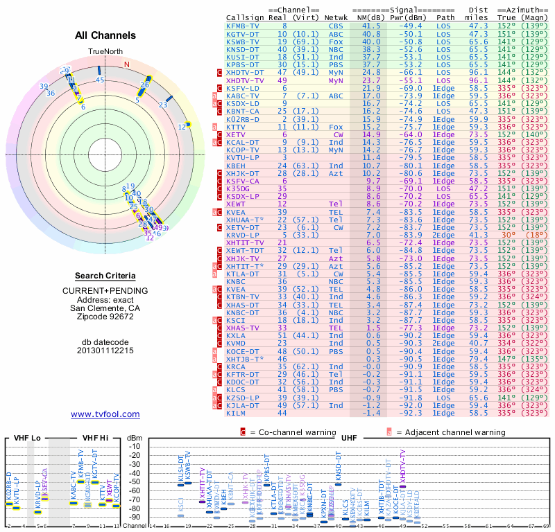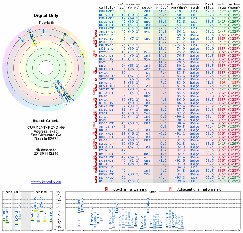Here are the results for your location. The transmitter database was last updated on June 7, 2013. For more information about these plots and how to interpret them, please check out the Signal Analysis FAQ.