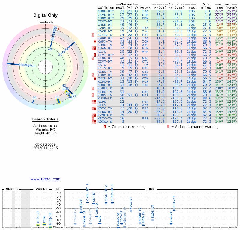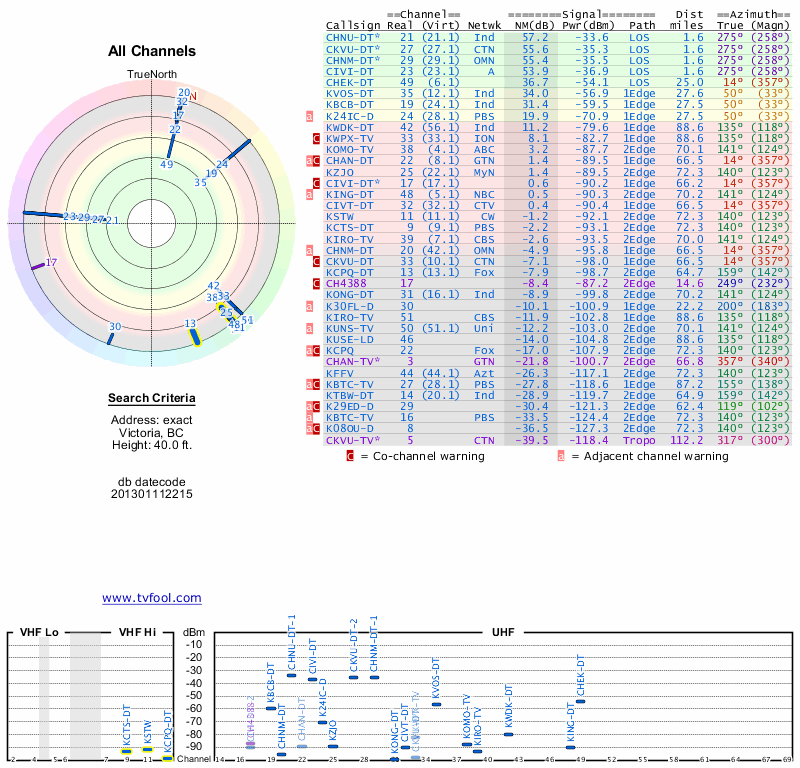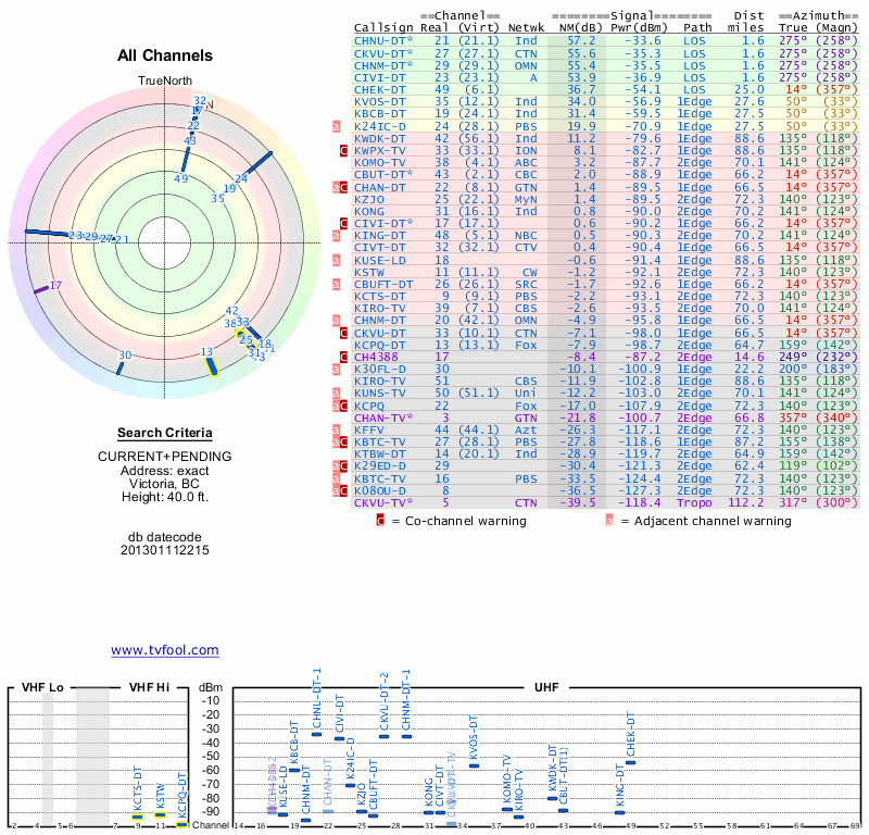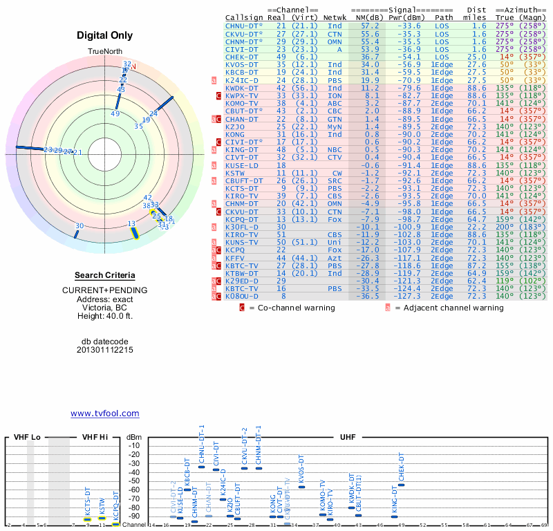 Here are the results for your location. The transmitter database was last updated on June 7, 2013. For more information about these plots and how to interpret them, please check out the Signal Analysis FAQ.