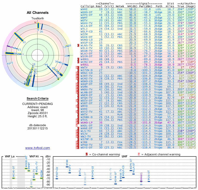 Here are the results for your location. The transmitter database was last updated on June 7, 2013. For more information about these plots and how to interpret them, please check out the Signal Analysis FAQ.