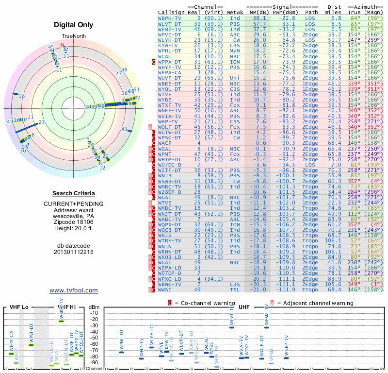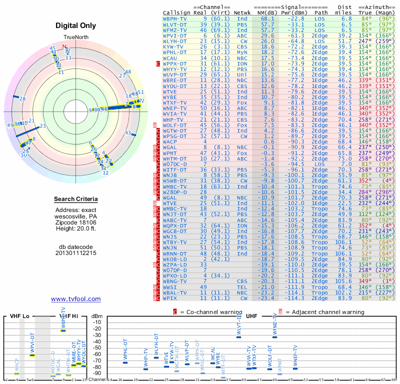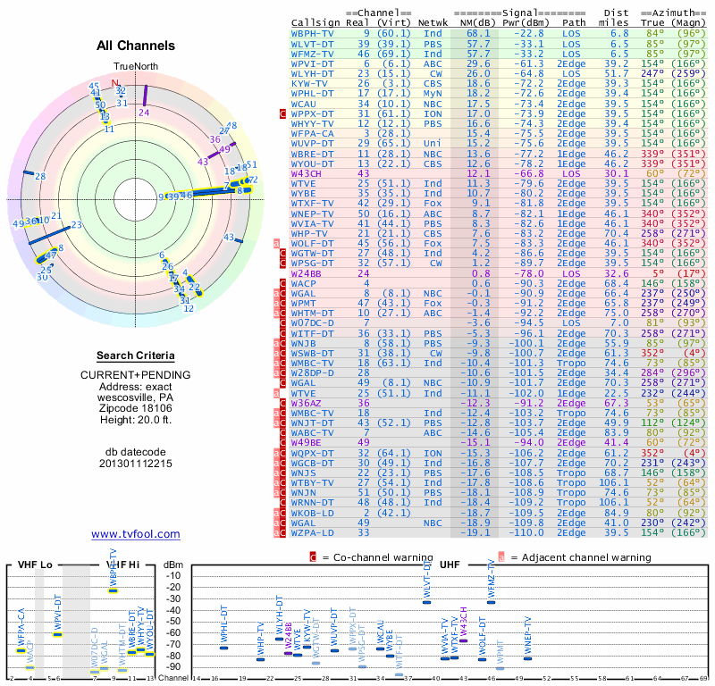 Here are the results for your location. The transmitter database was last updated on June 7, 2013. For more information about these plots and how to interpret them, please check out the Signal Analysis FAQ.
