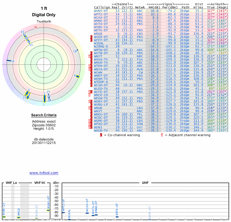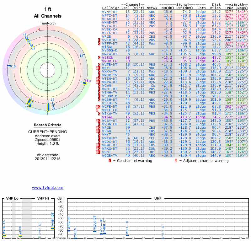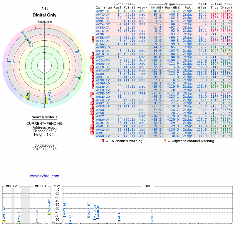Here are the results for your location. The transmitter database was last updated on June 7, 2013. For more information about these plots and how to interpret them, please check out the Signal Analysis FAQ.
