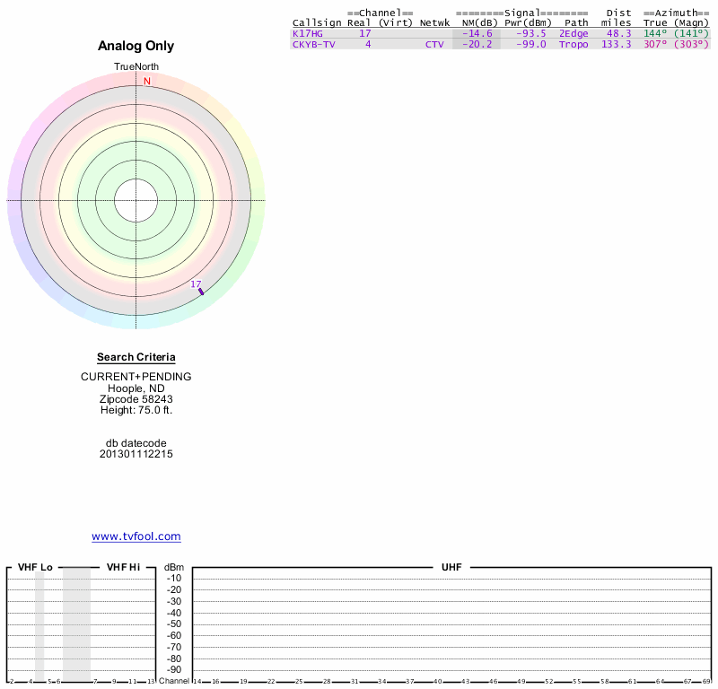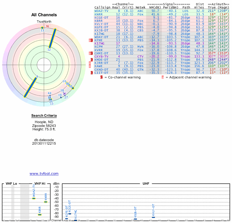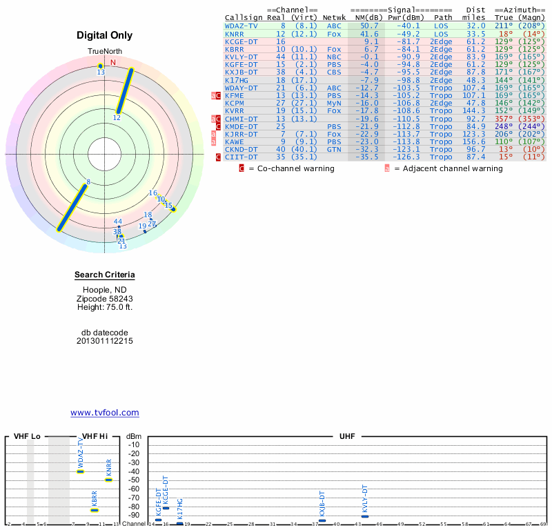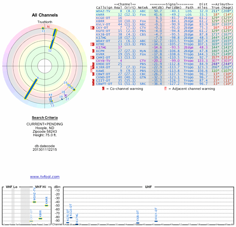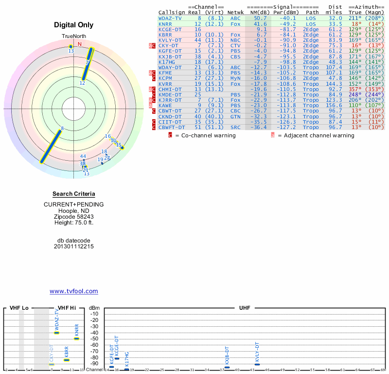 Here are the results for your location. The transmitter database was last updated on June 7, 2013. For more information about these plots and how to interpret them, please check out the Signal Analysis FAQ.