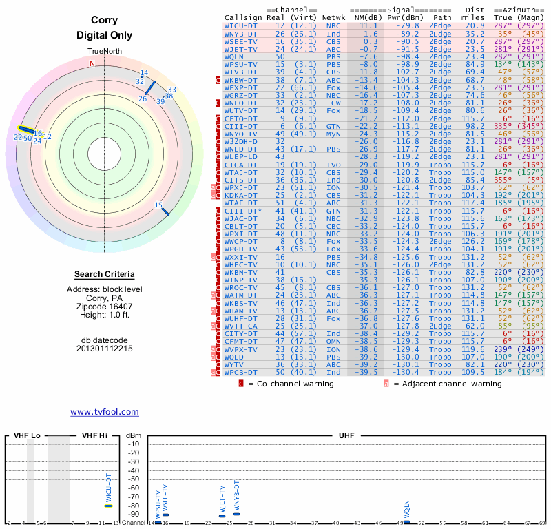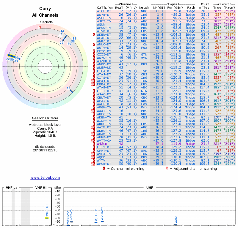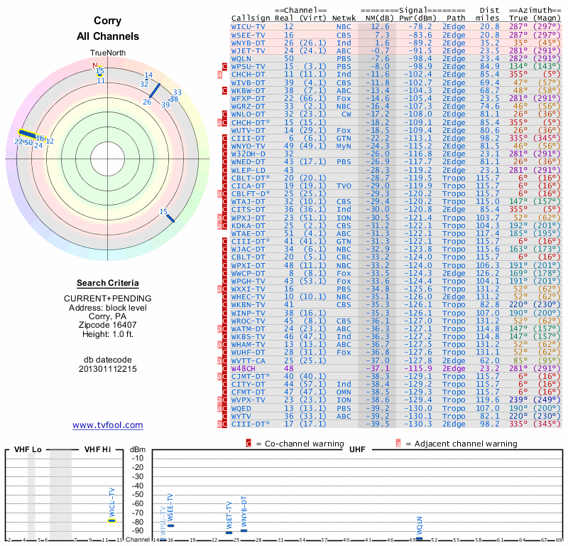 Here are the results for your location. The transmitter database was last updated on June 7, 2013. For more information about these plots and how to interpret them, please check out the Signal Analysis FAQ.