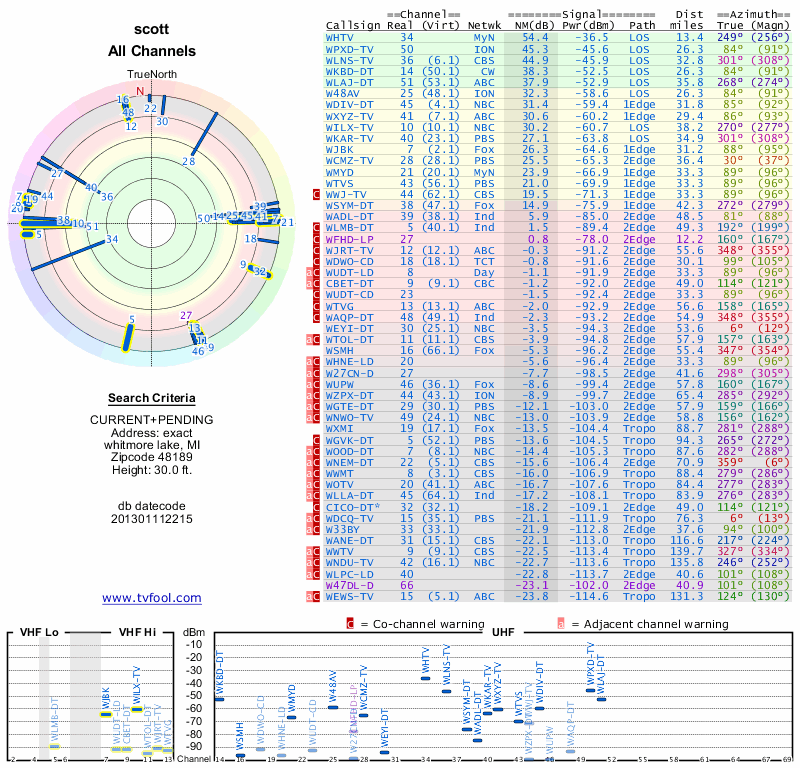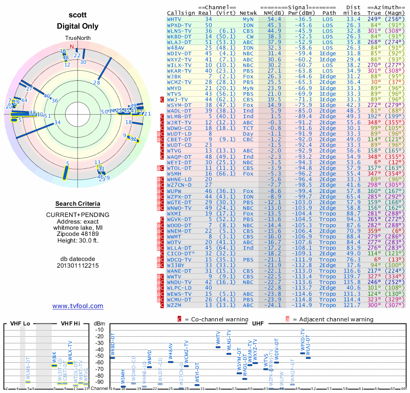 Here are the results for your location. The transmitter database was last updated on June 7, 2013. For more information about these plots and how to interpret them, please check out the Signal Analysis FAQ.
