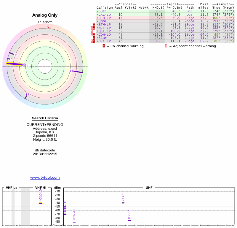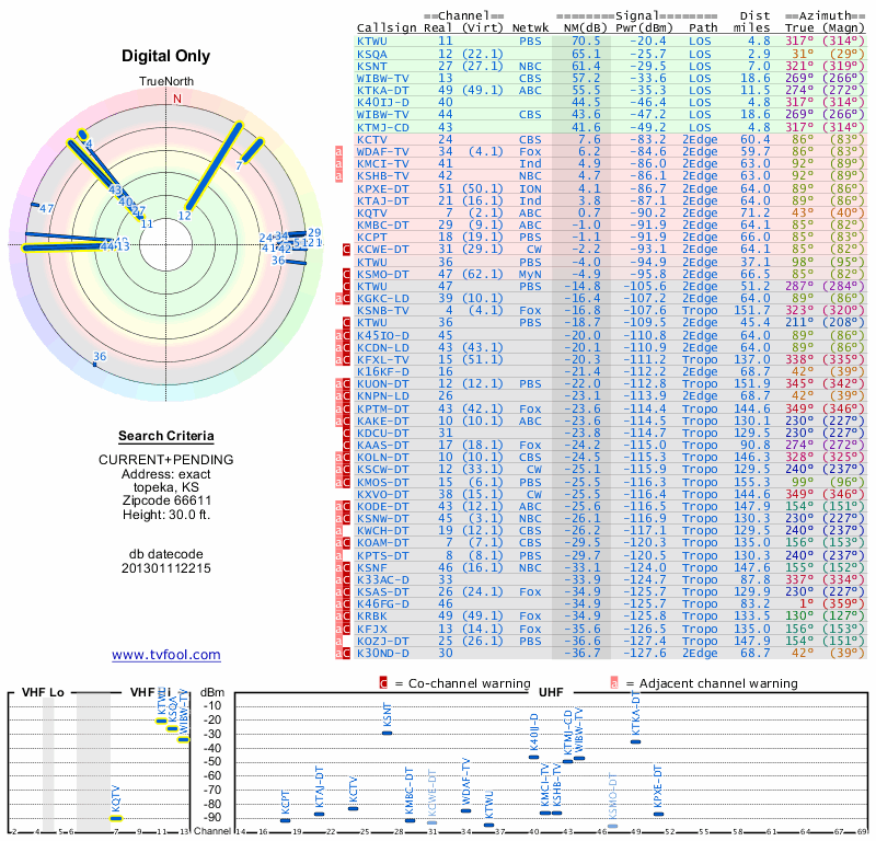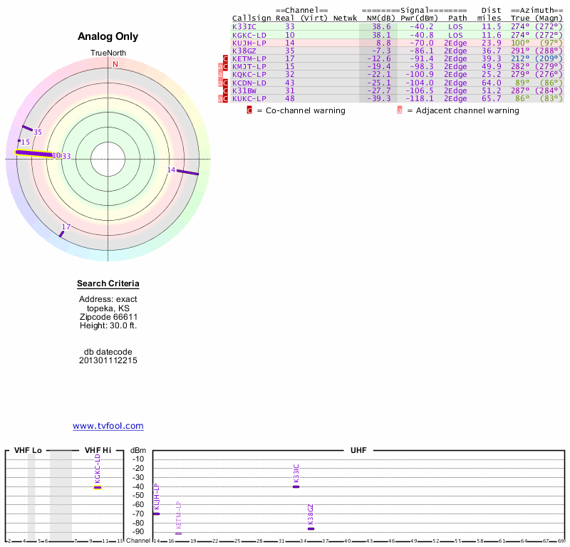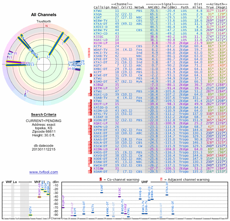 Here are the results for your location. The transmitter database was last updated on June 7, 2013. For more information about these plots and how to interpret them, please check out the Signal Analysis FAQ.