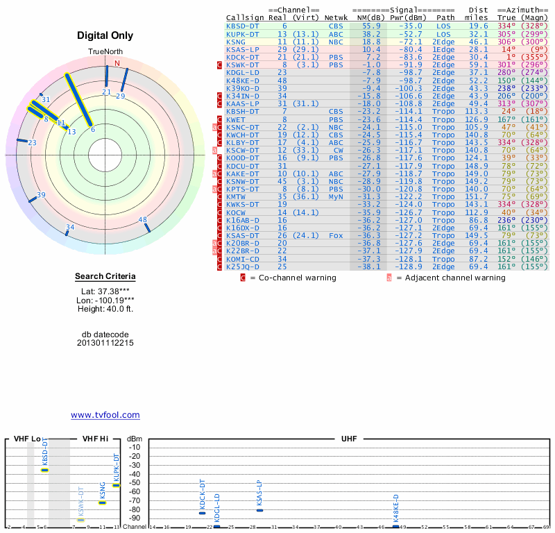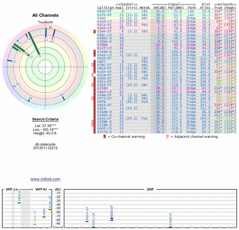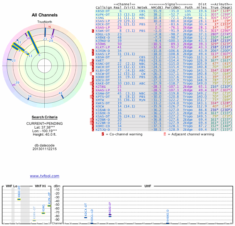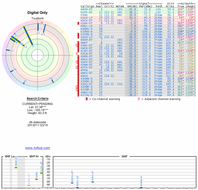Here are the results for your location. The transmitter database was last updated on June 7, 2013. For more information about these plots and how to interpret them, please check out the Signal Analysis FAQ.