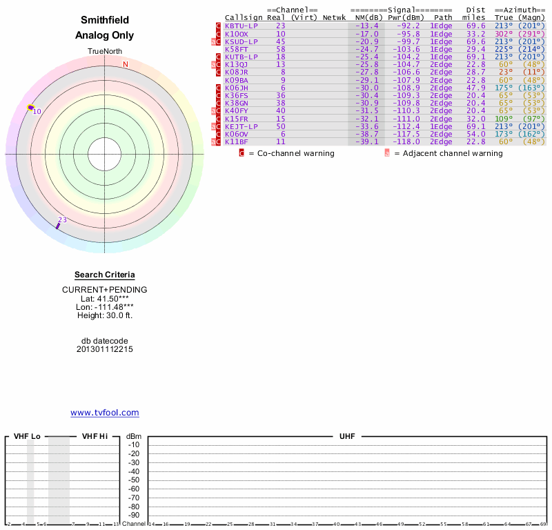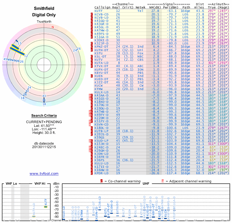 Here are the results for your location. The transmitter database was last updated on June 7, 2013. For more information about these plots and how to interpret them, please check out the Signal Analysis FAQ.