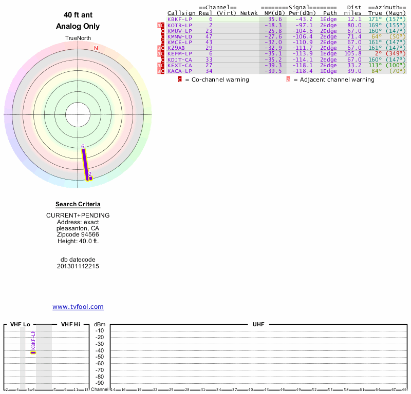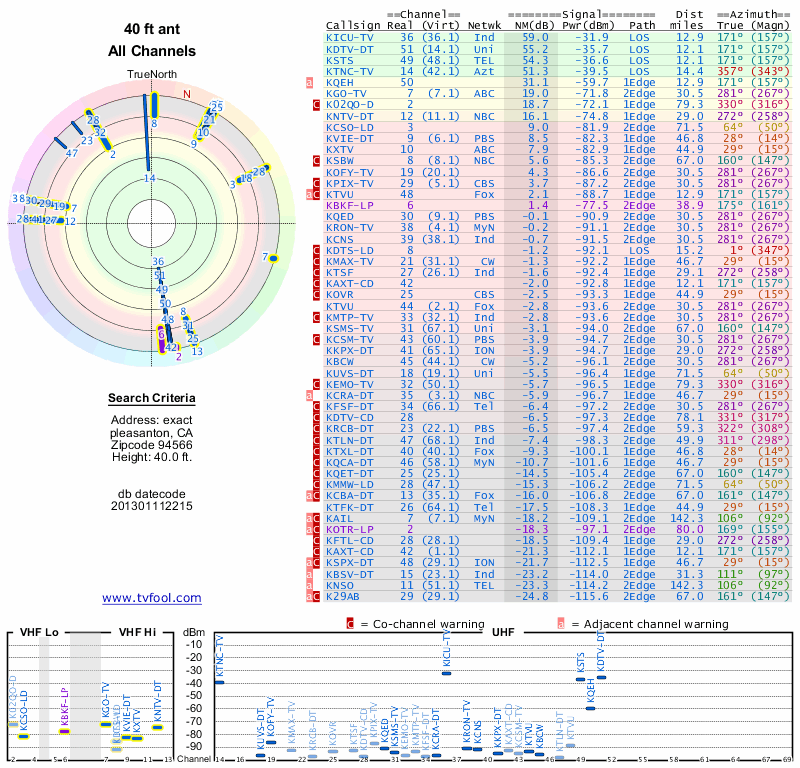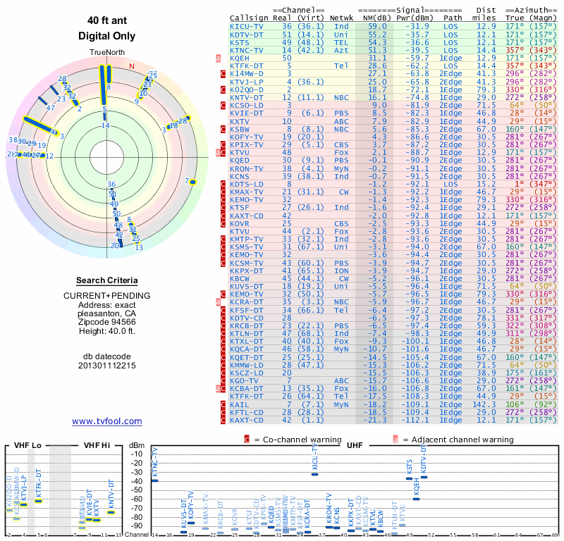 Here are the results for your location. The transmitter database was last updated on June 7, 2013. For more information about these plots and how to interpret them, please check out the Signal Analysis FAQ.