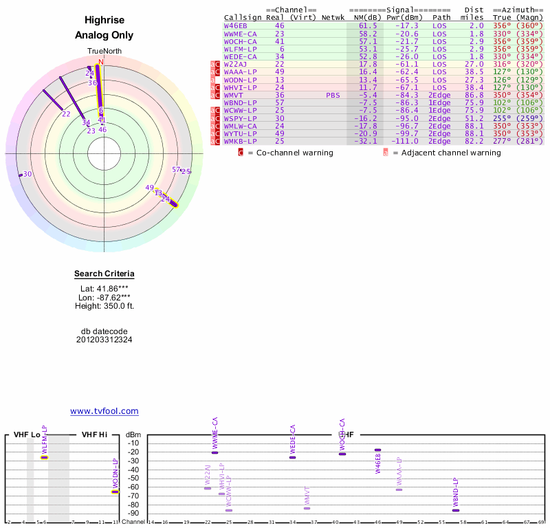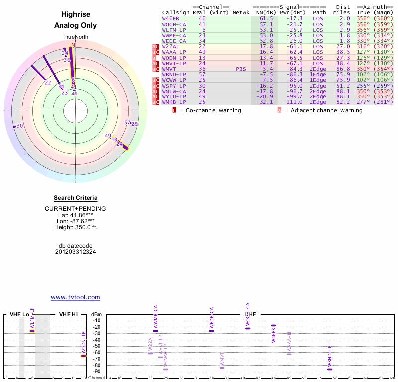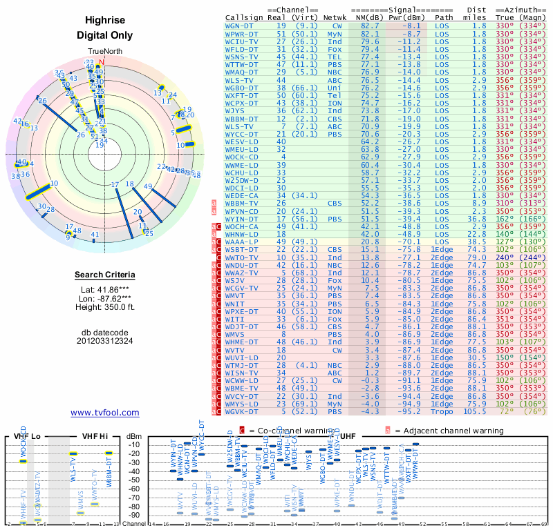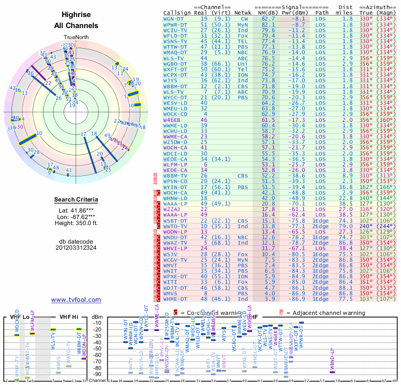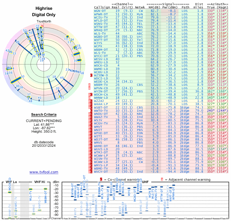 Here are the results for your location. The transmitter database was last updated on June 7, 2013. For more information about these plots and how to interpret them, please check out the Signal Analysis FAQ.