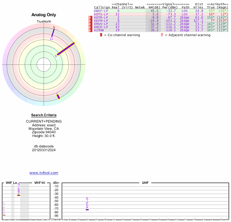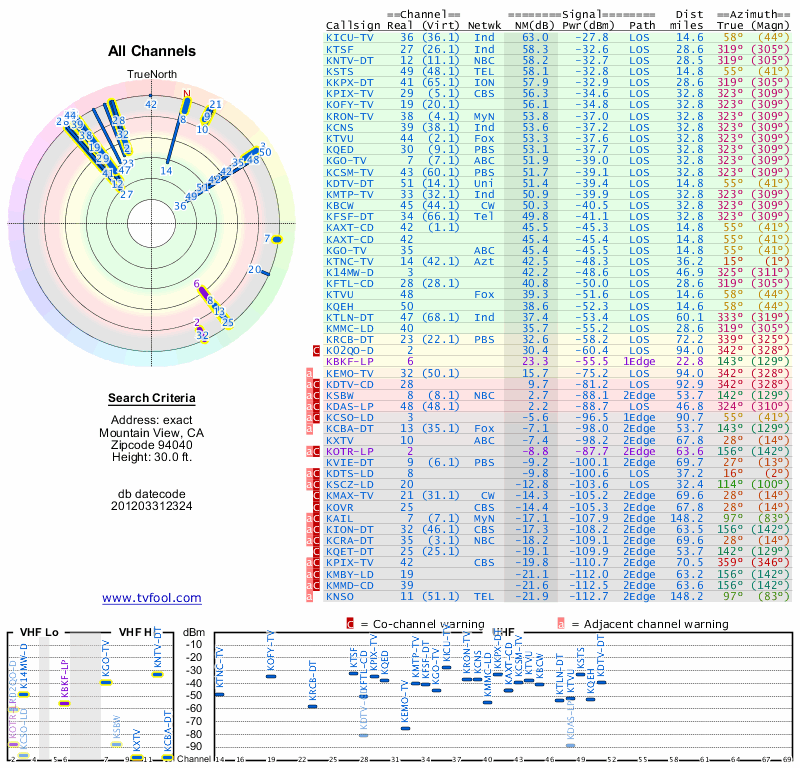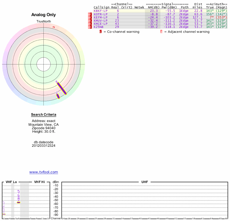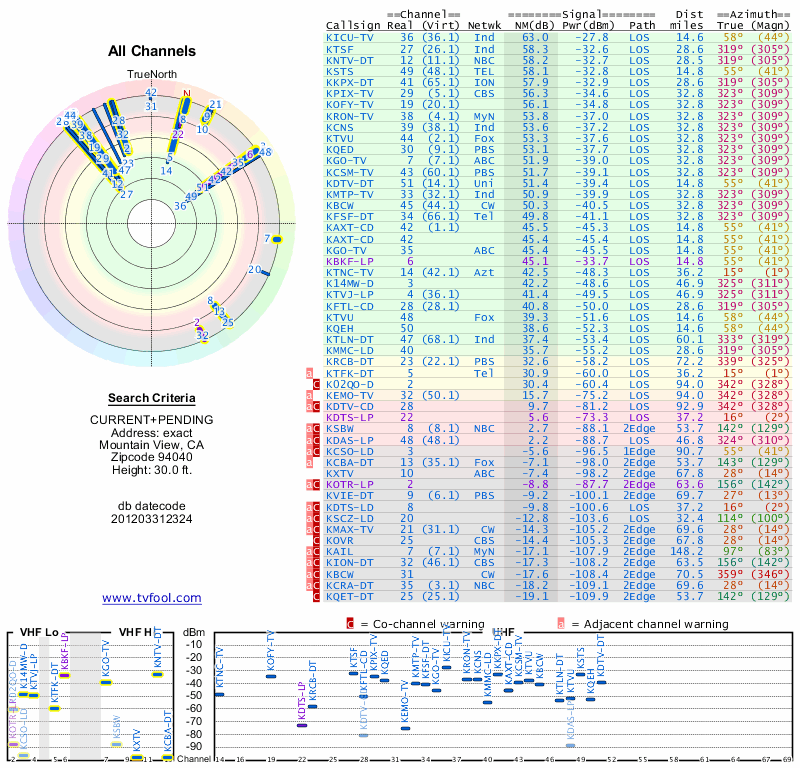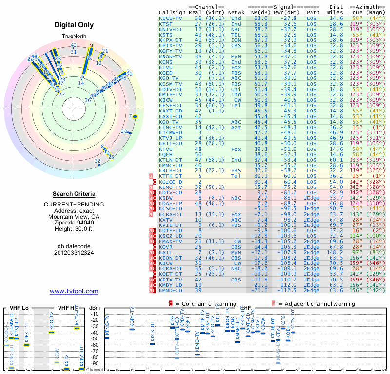 Here are the results for your location. The transmitter database was last updated on June 7, 2013. For more information about these plots and how to interpret them, please check out the Signal Analysis FAQ.
