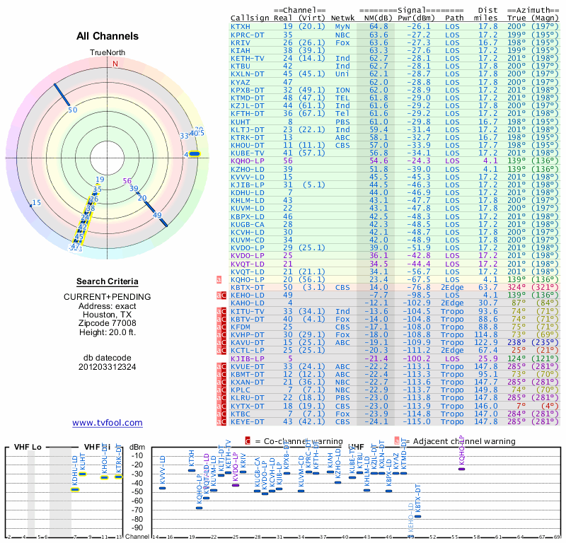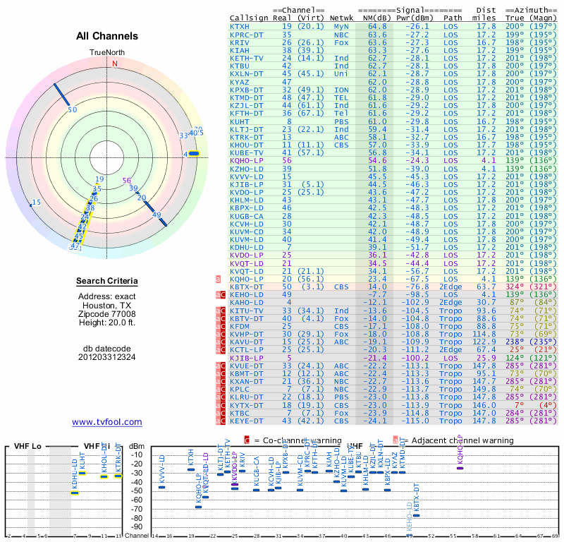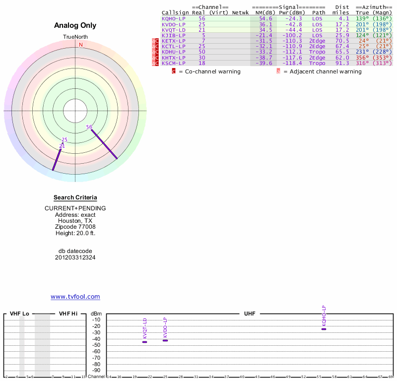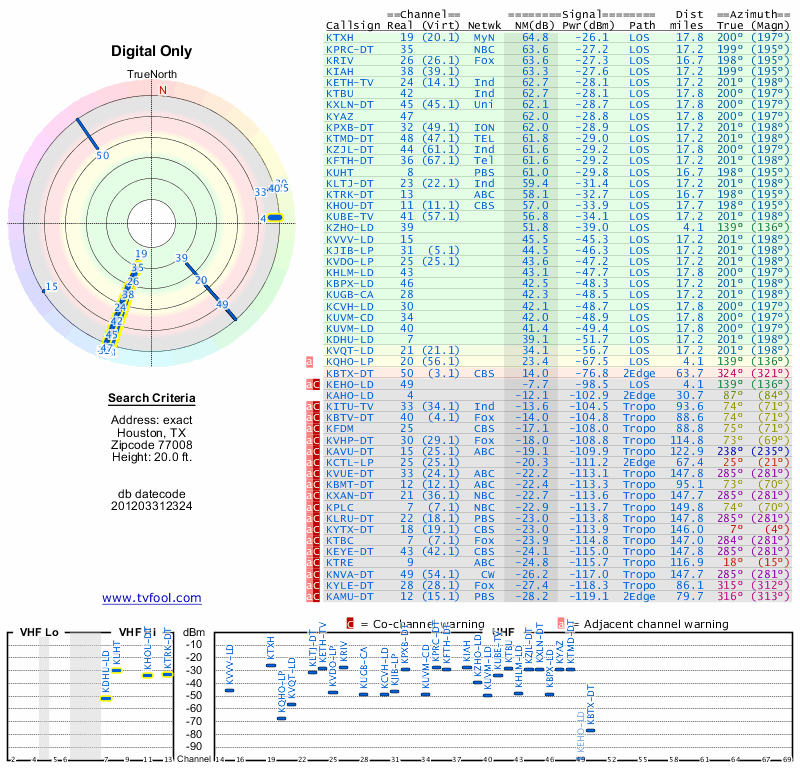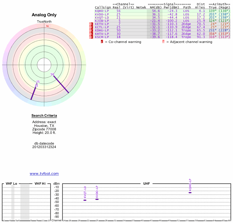 Here are the results for your location. The transmitter database was last updated on June 7, 2013. For more information about these plots and how to interpret them, please check out the Signal Analysis FAQ.