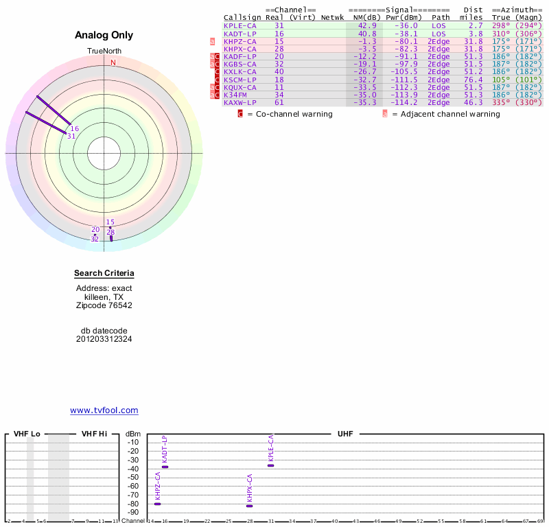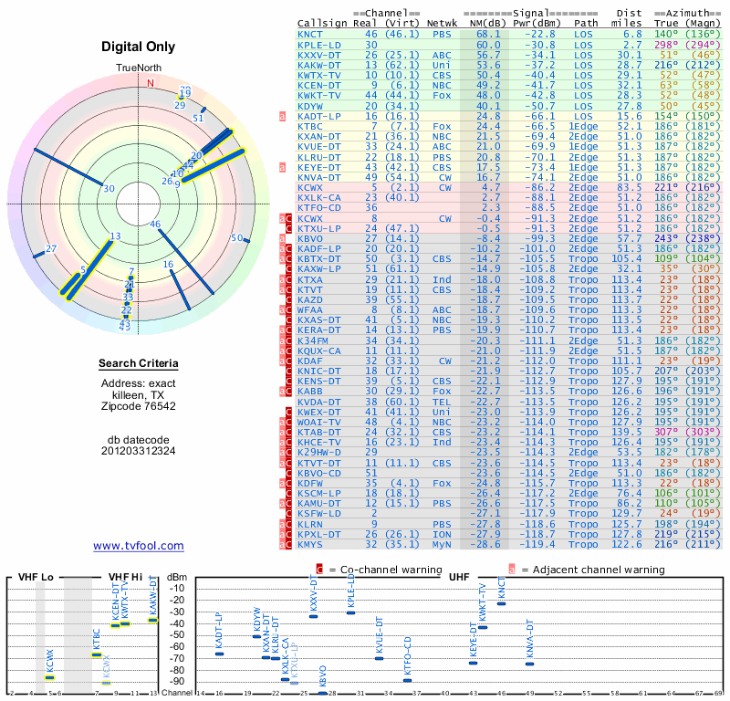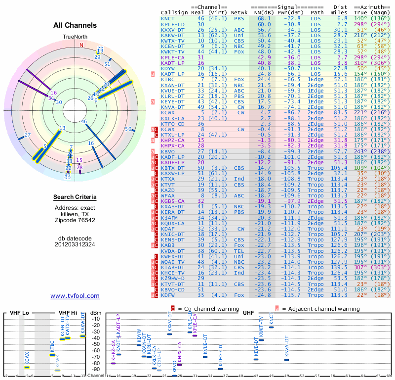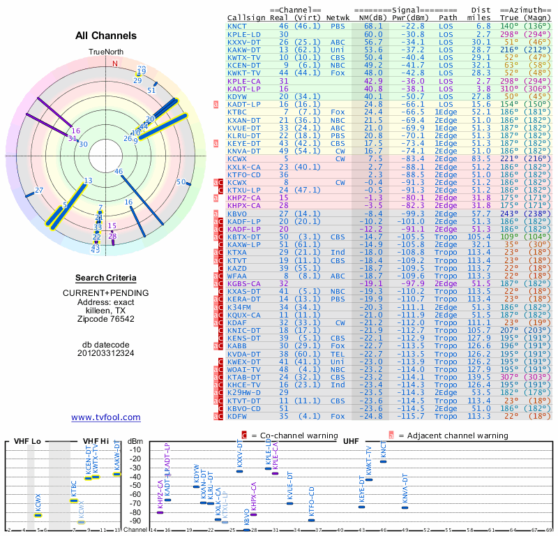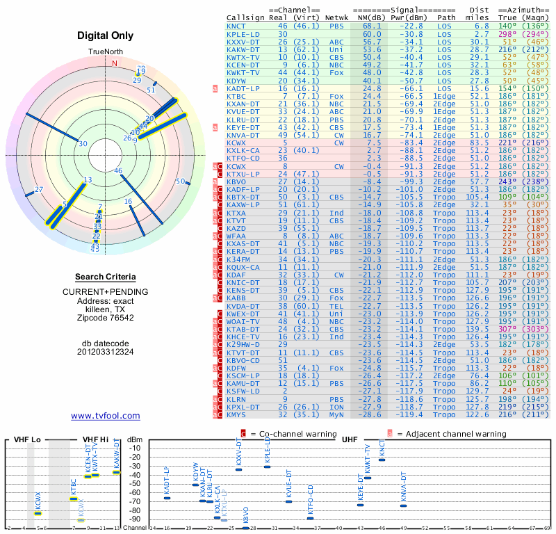 Here are the results for your location. The transmitter database was last updated on June 7, 2013. For more information about these plots and how to interpret them, please check out the Signal Analysis FAQ.