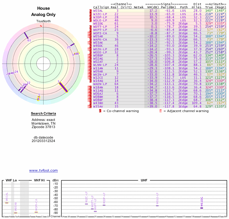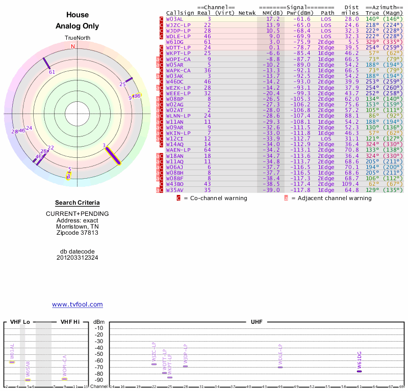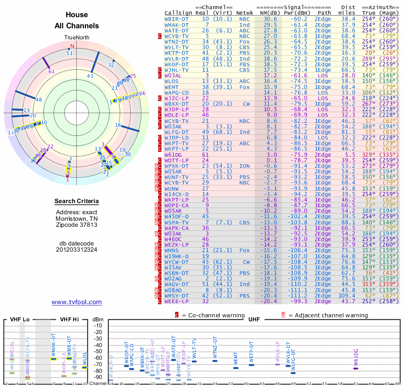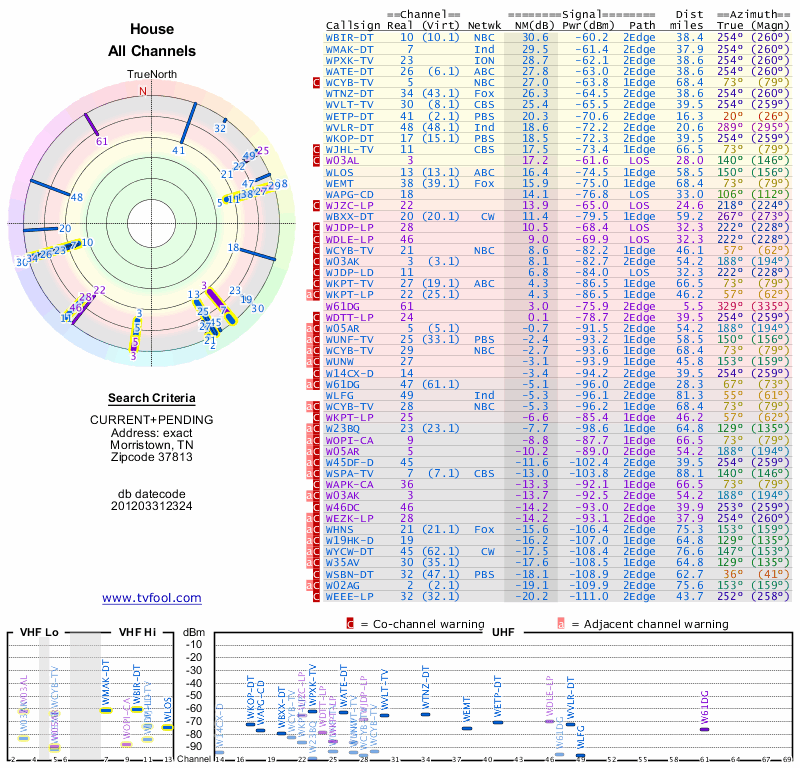 Here are the results for your location. The transmitter database was last updated on June 7, 2013. For more information about these plots and how to interpret them, please check out the Signal Analysis FAQ.