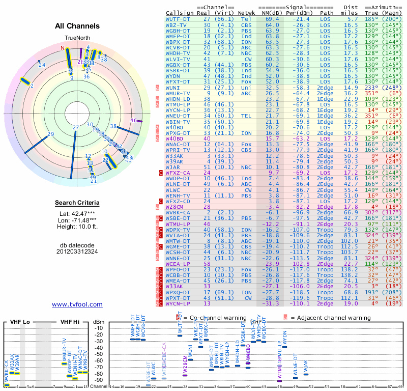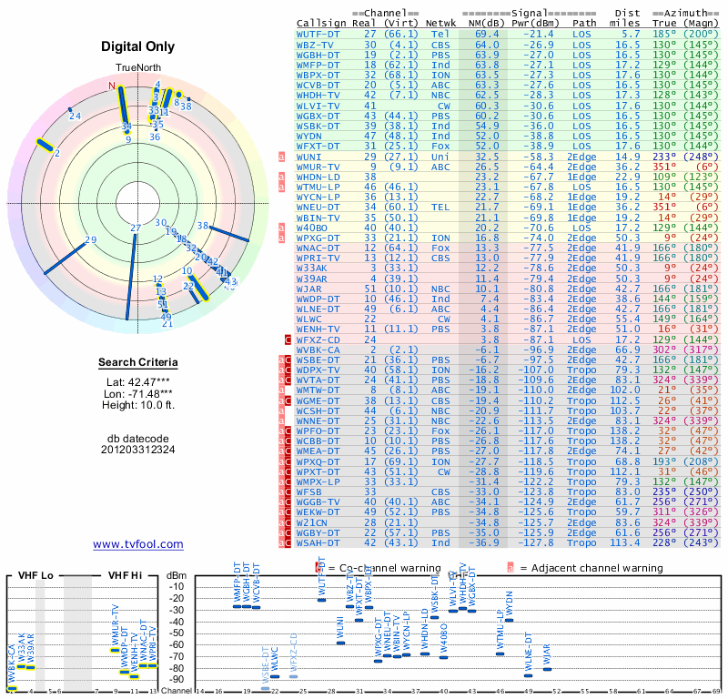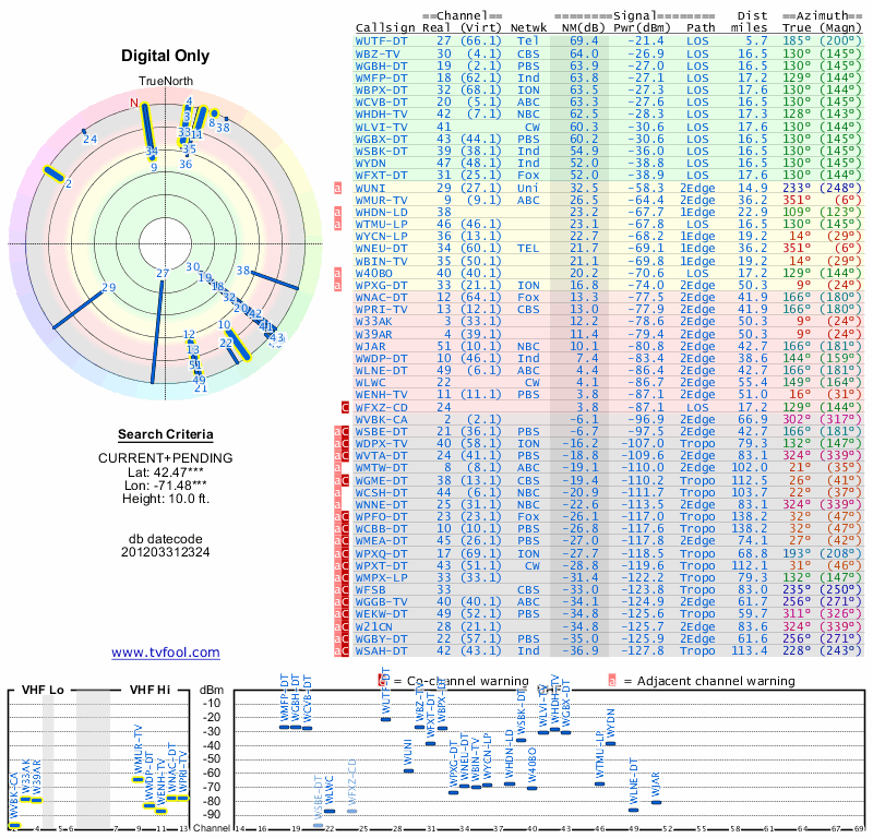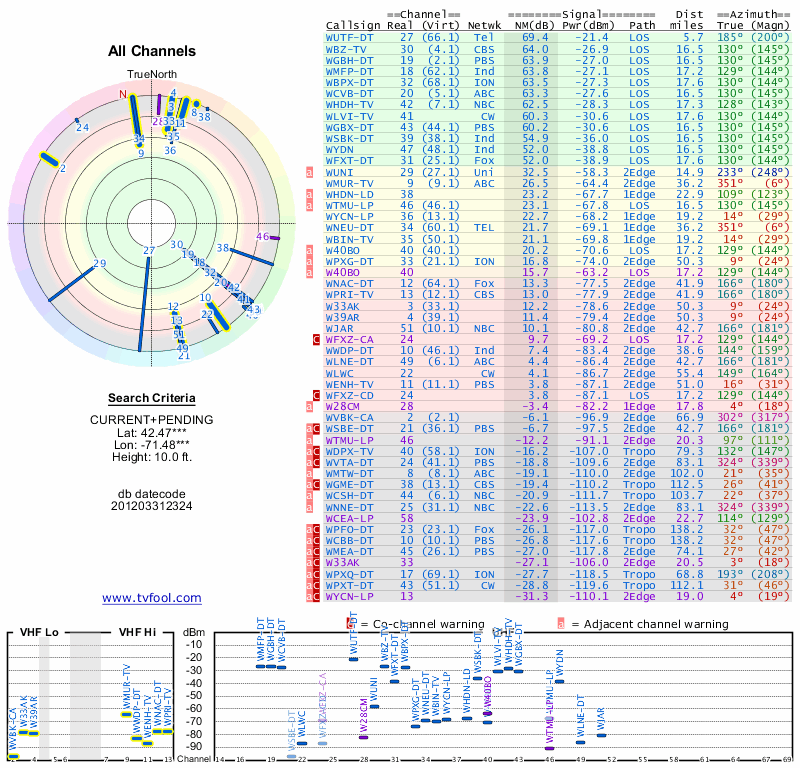 Here are the results for your location. The transmitter database was last updated on June 7, 2013. For more information about these plots and how to interpret them, please check out the Signal Analysis FAQ.