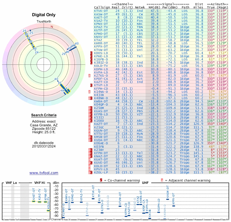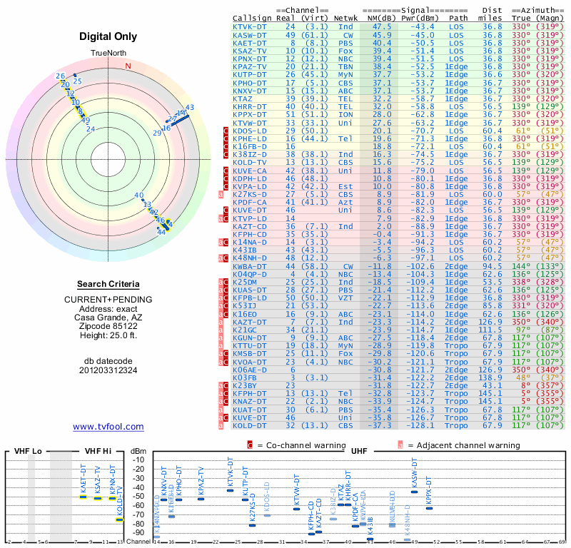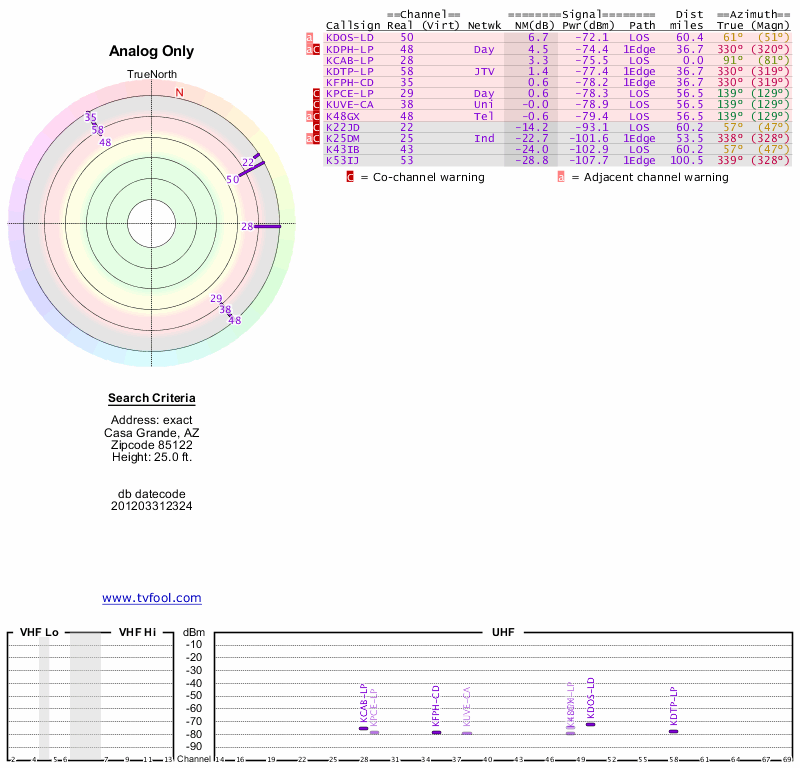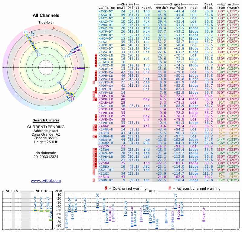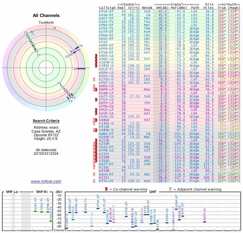 Here are the results for your location. The transmitter database was last updated on June 7, 2013. For more information about these plots and how to interpret them, please check out the Signal Analysis FAQ.