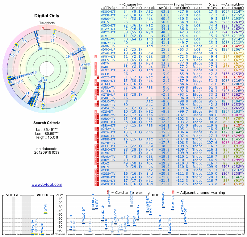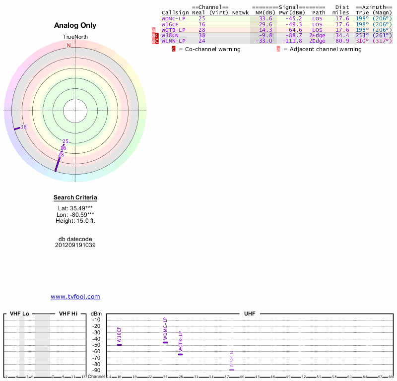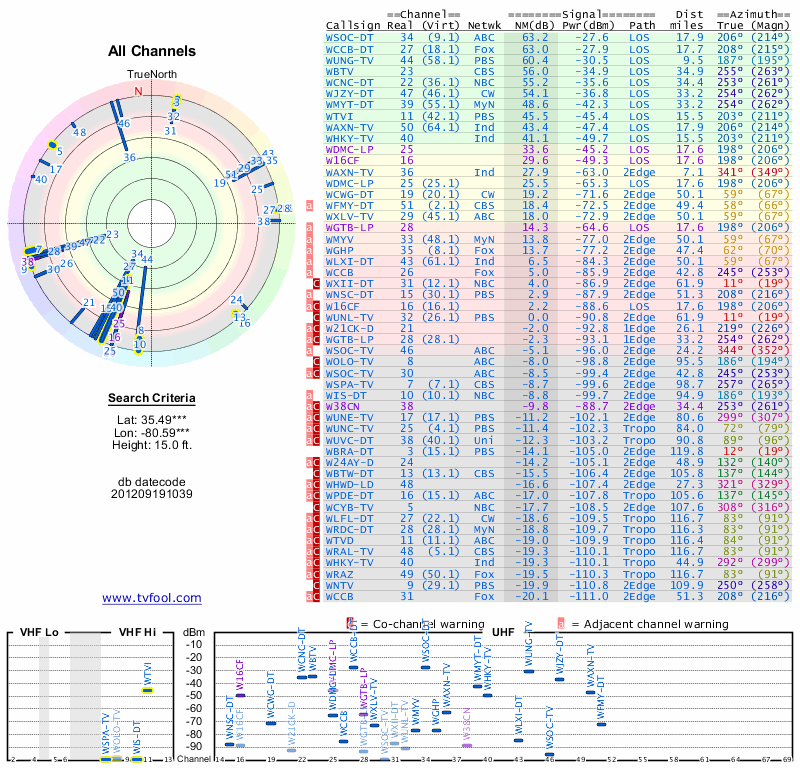 Here are the results for your location. The transmitter database was last updated on June 7, 2013. For more information about these plots and how to interpret them, please check out the Signal Analysis FAQ.