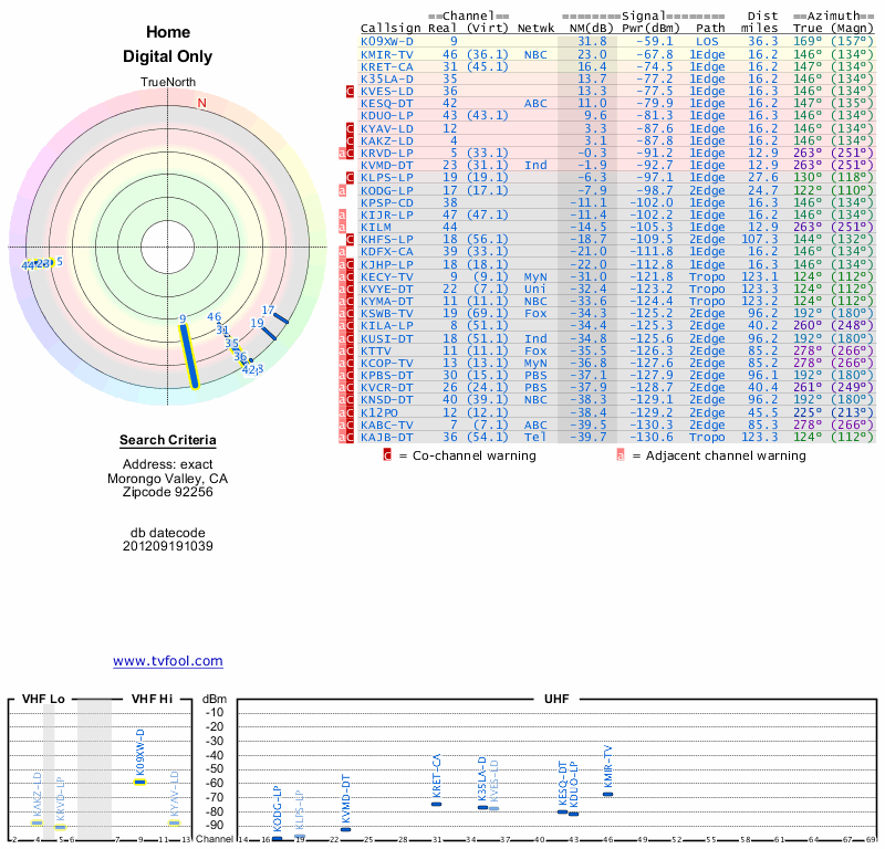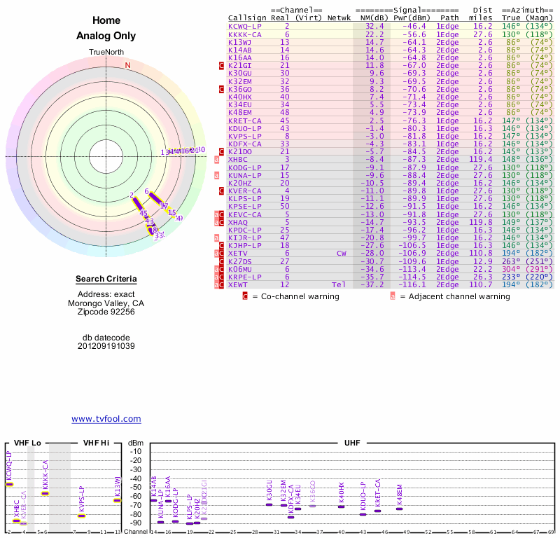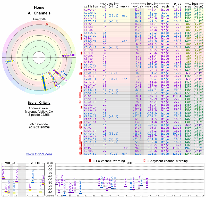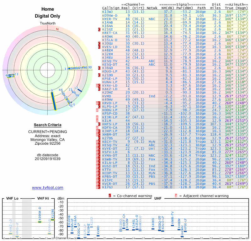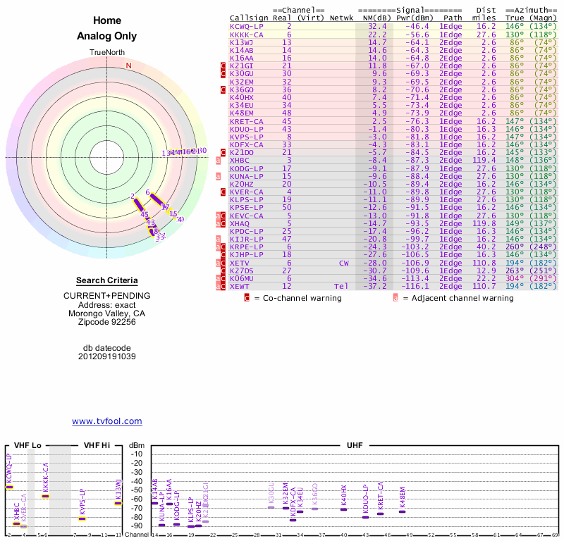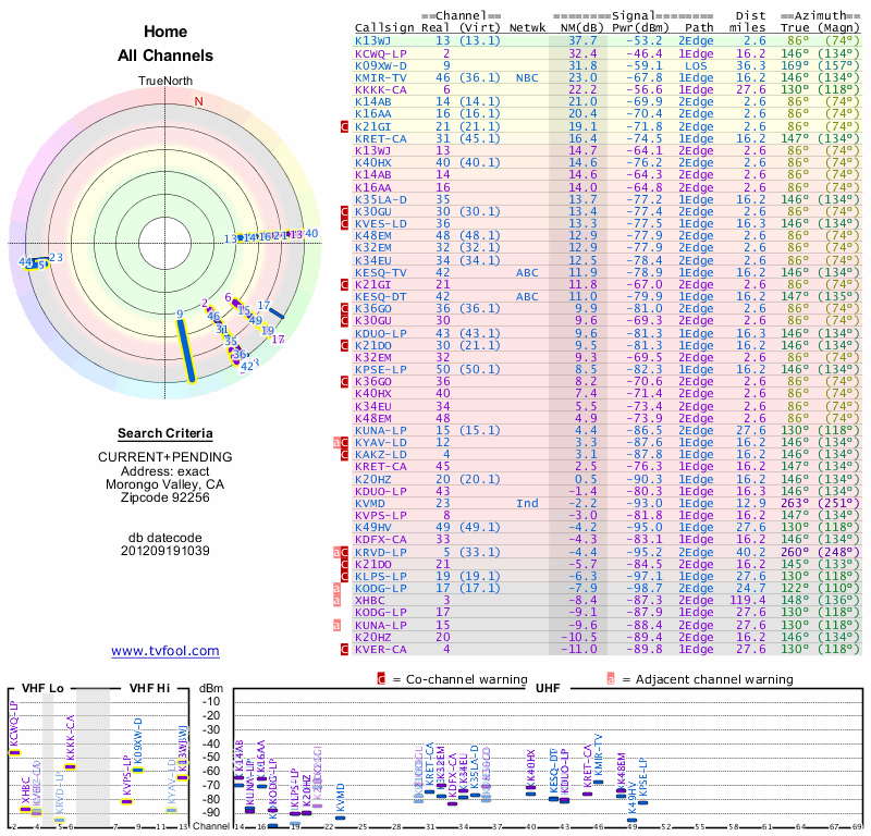 Here are the results for your location. The transmitter database was last updated on June 7, 2013. For more information about these plots and how to interpret them, please check out the Signal Analysis FAQ.