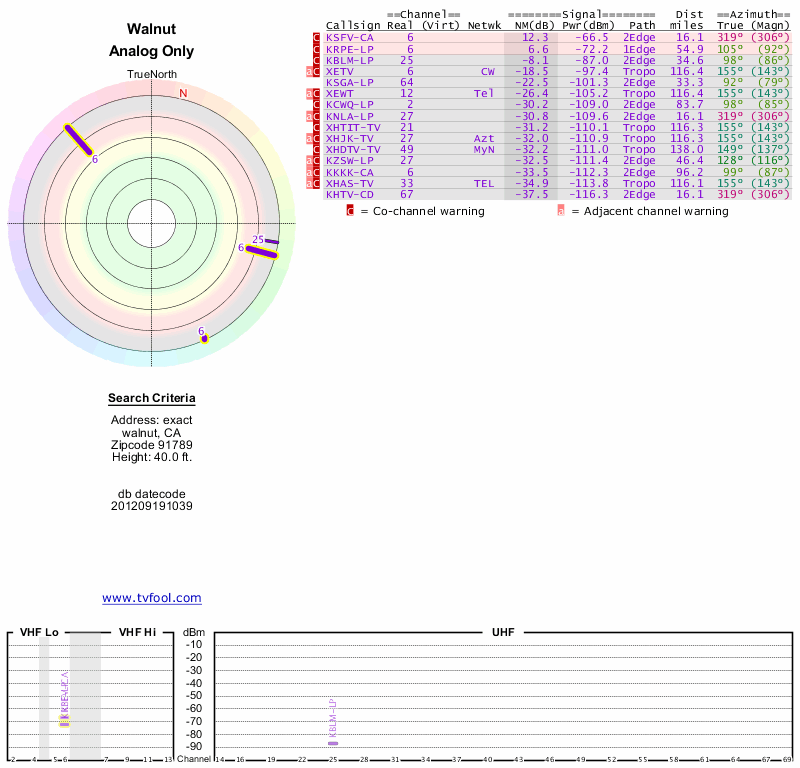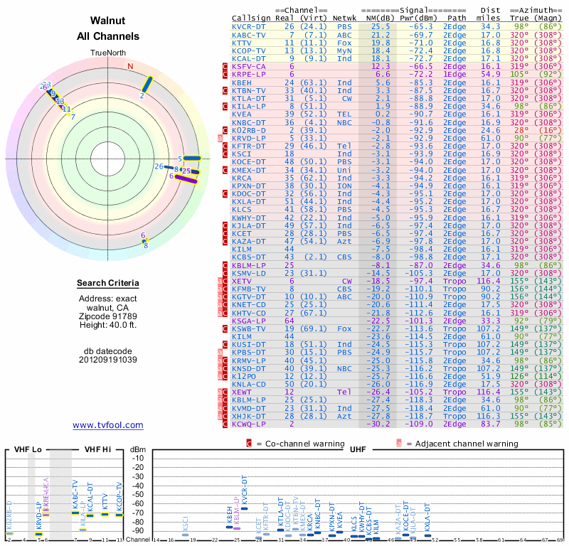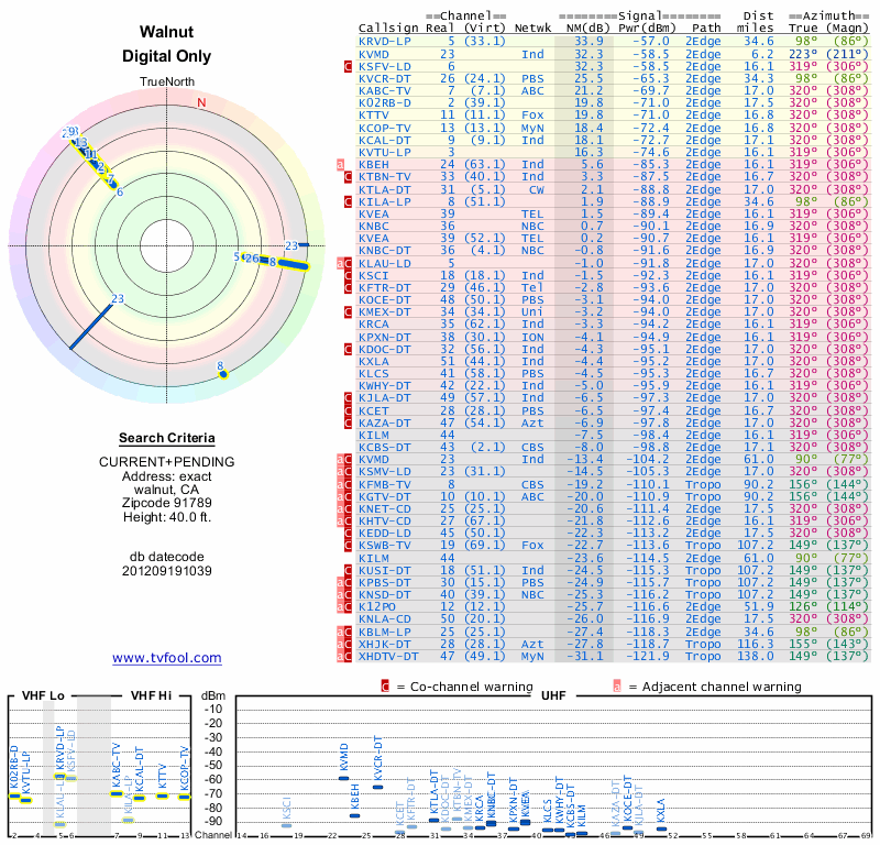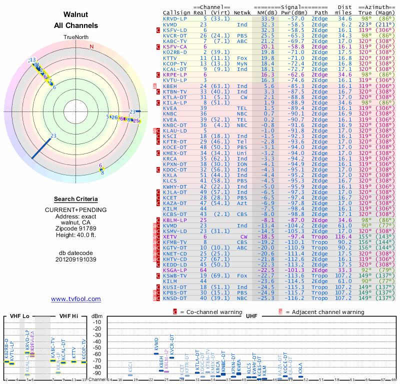 Here are the results for your location. The transmitter database was last updated on June 7, 2013. For more information about these plots and how to interpret them, please check out the Signal Analysis FAQ.