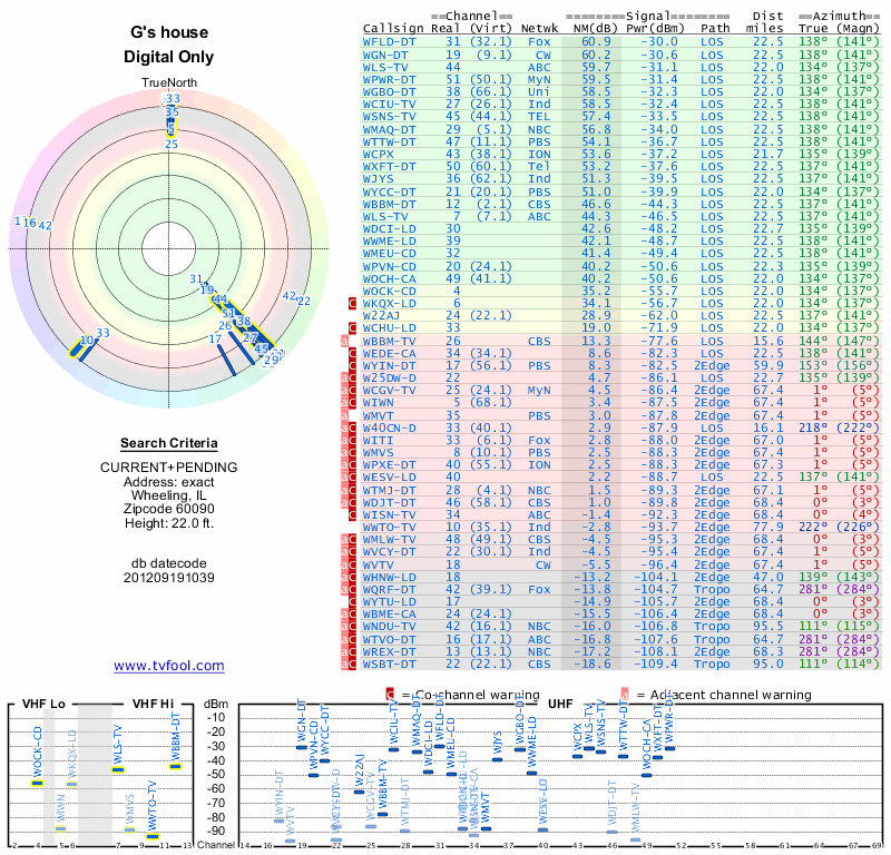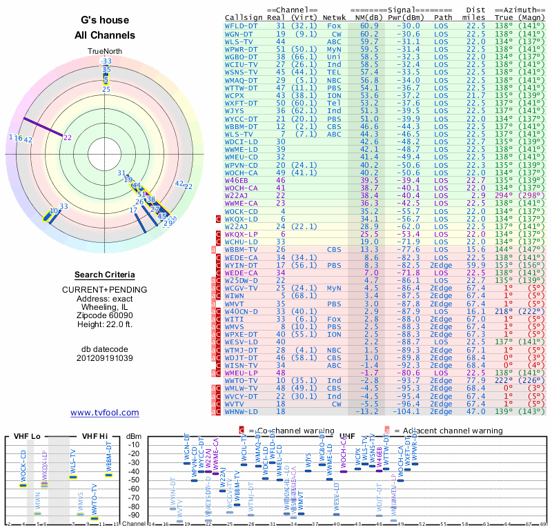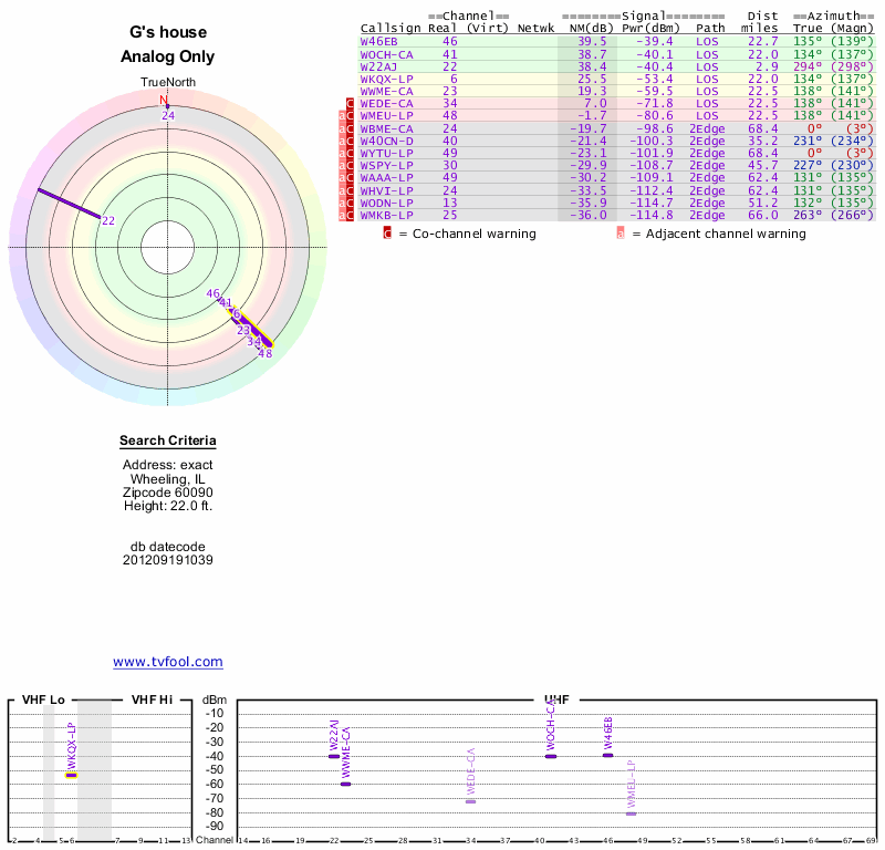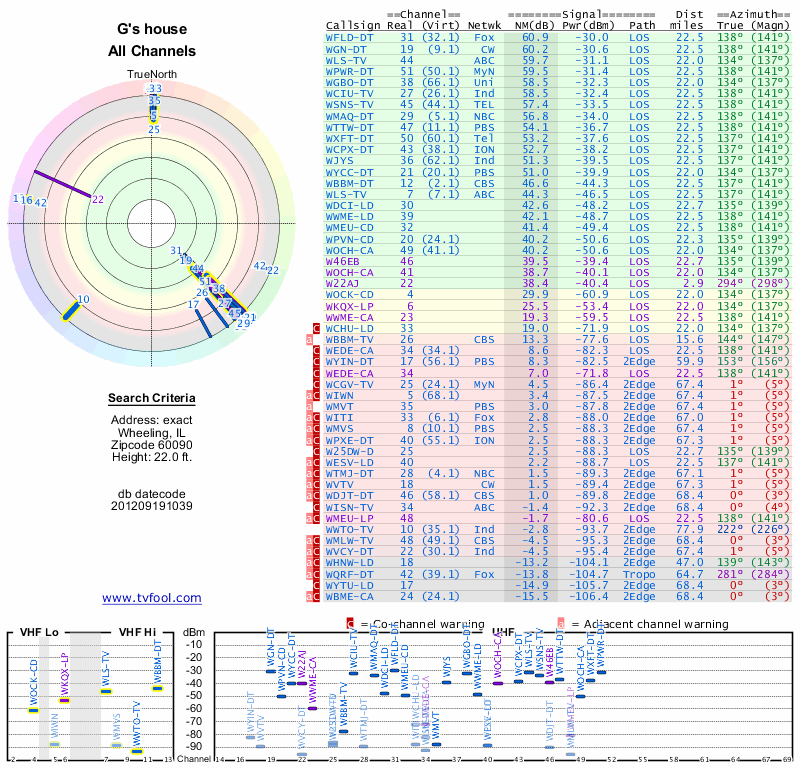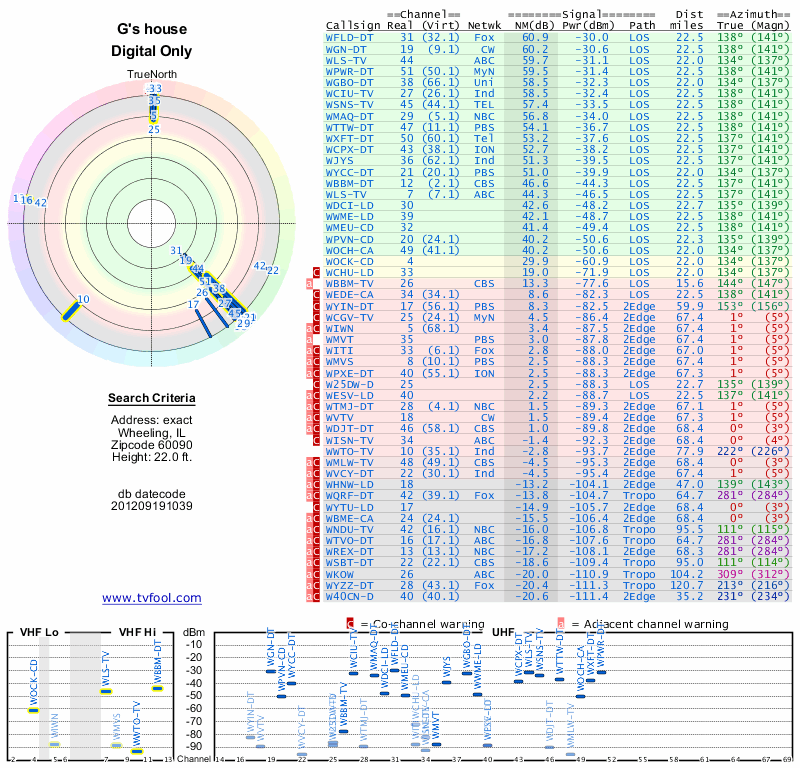 Here are the results for your location. The transmitter database was last updated on June 7, 2013. For more information about these plots and how to interpret them, please check out the Signal Analysis FAQ.