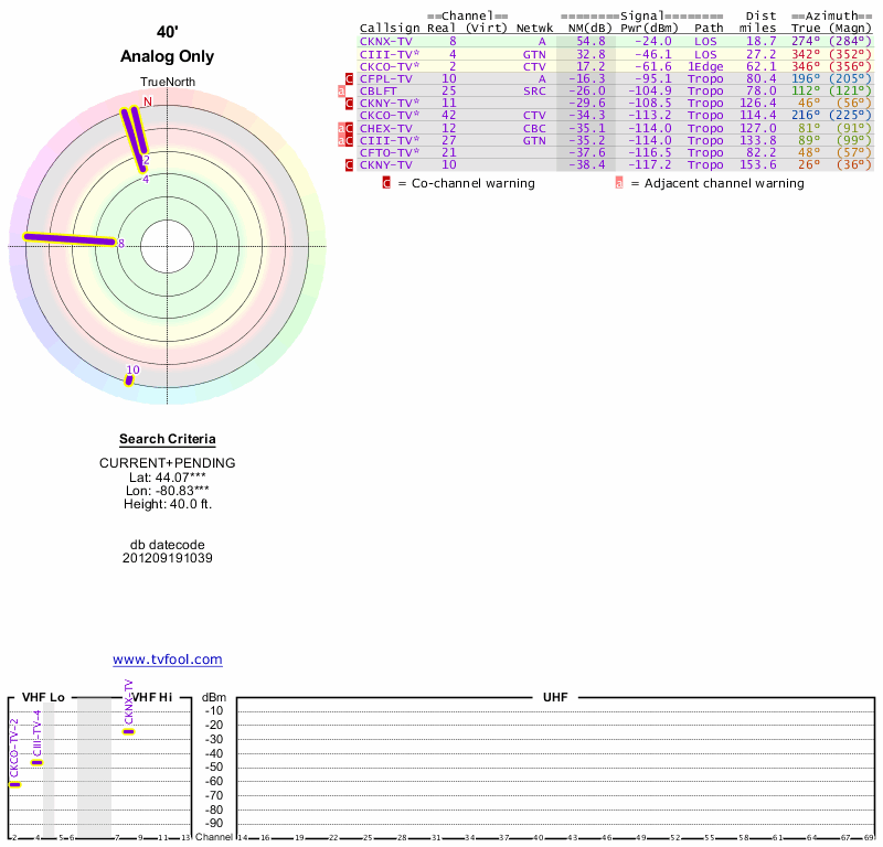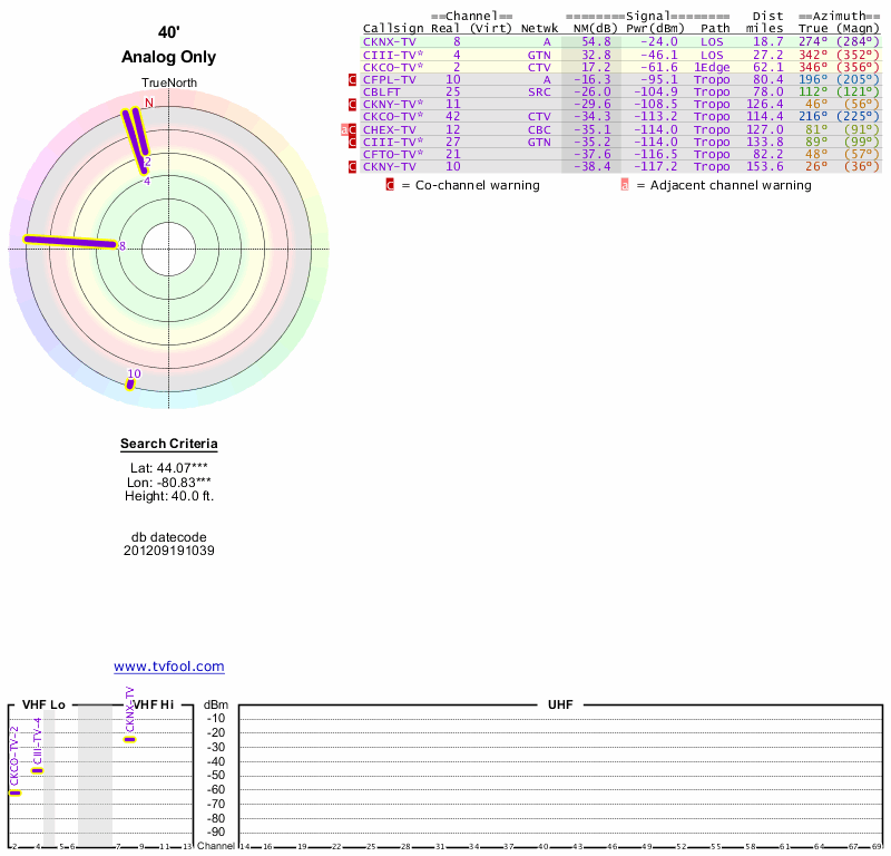 Here are the results for your location. The transmitter database was last updated on June 7, 2013. For more information about these plots and how to interpret them, please check out the Signal Analysis FAQ.