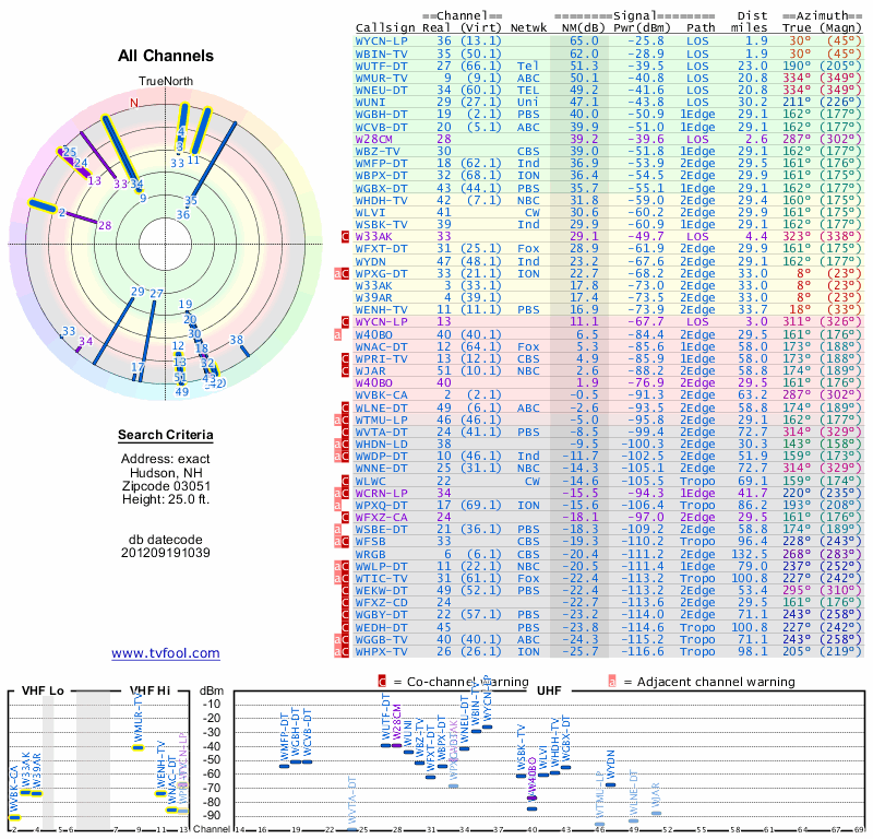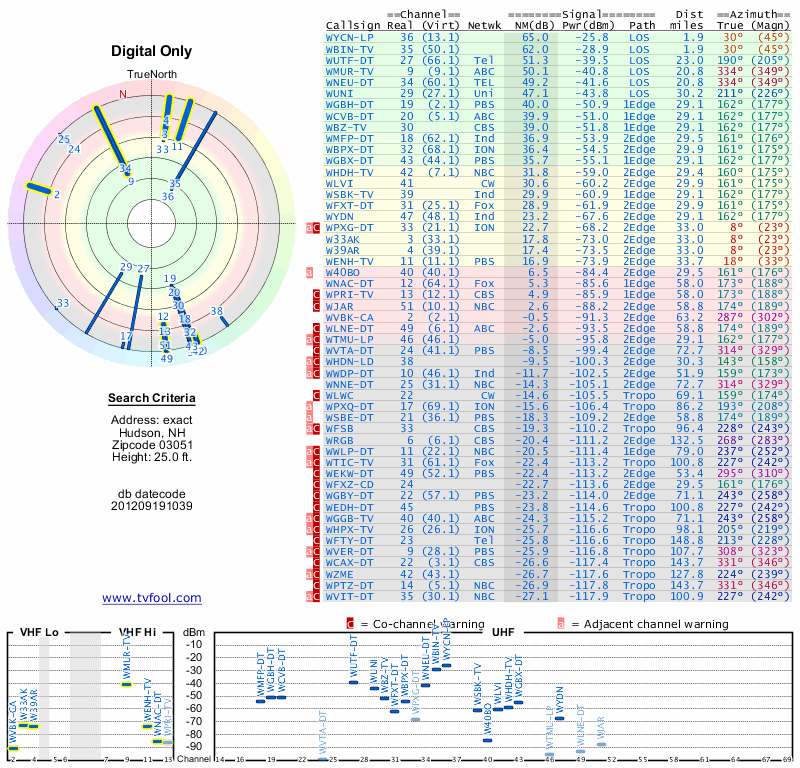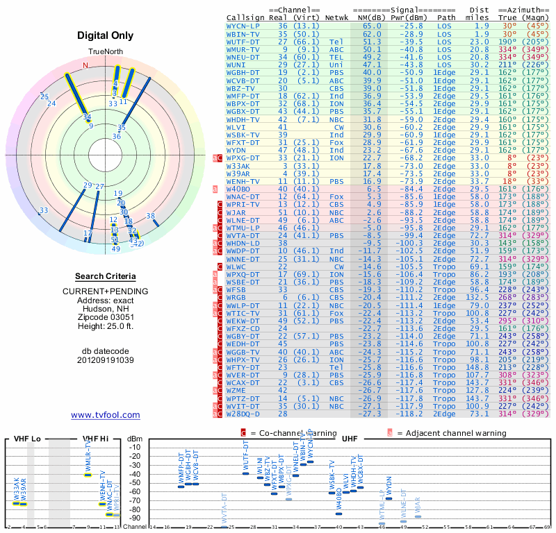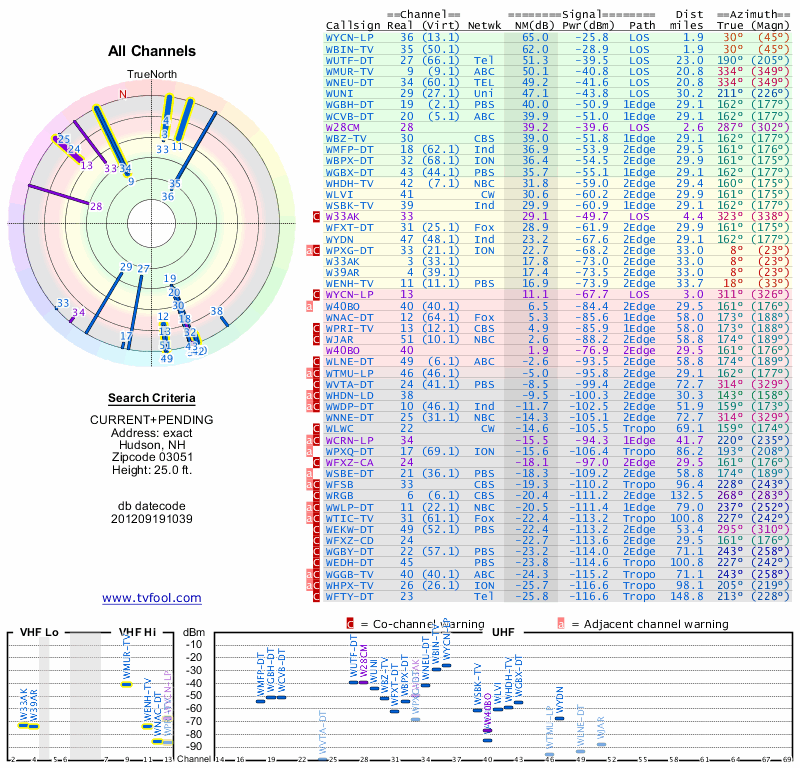 Here are the results for your location. The transmitter database was last updated on June 7, 2013. For more information about these plots and how to interpret them, please check out the Signal Analysis FAQ.
