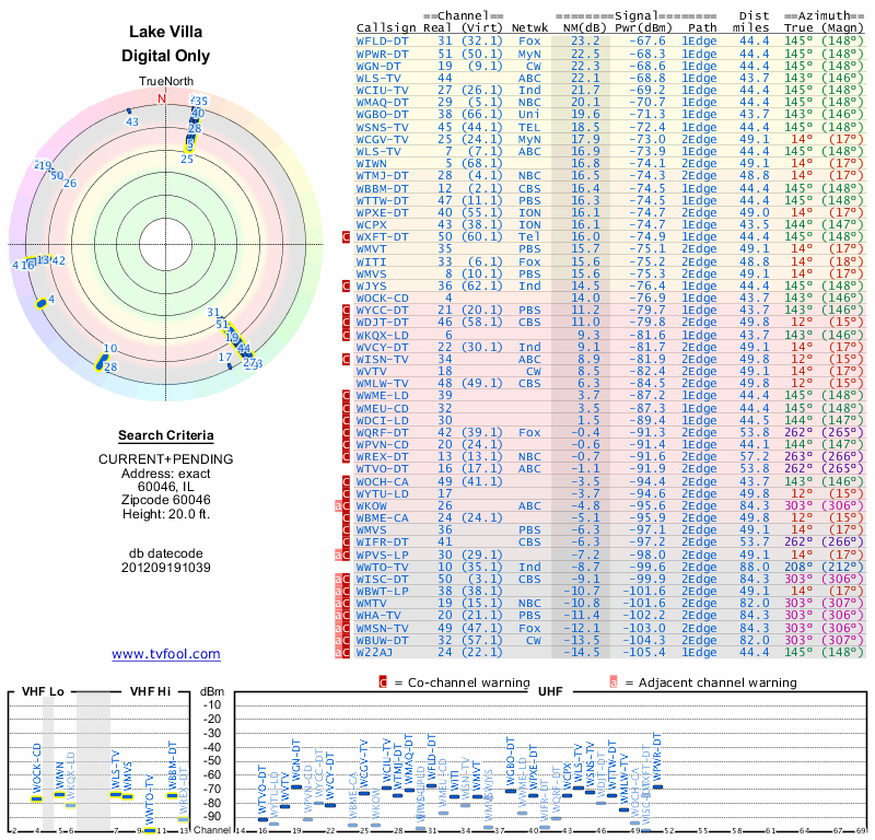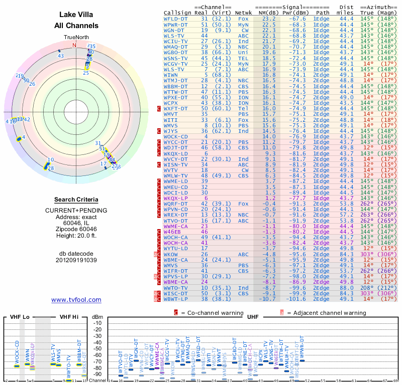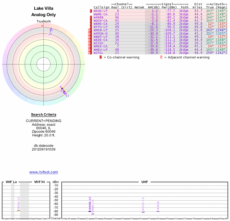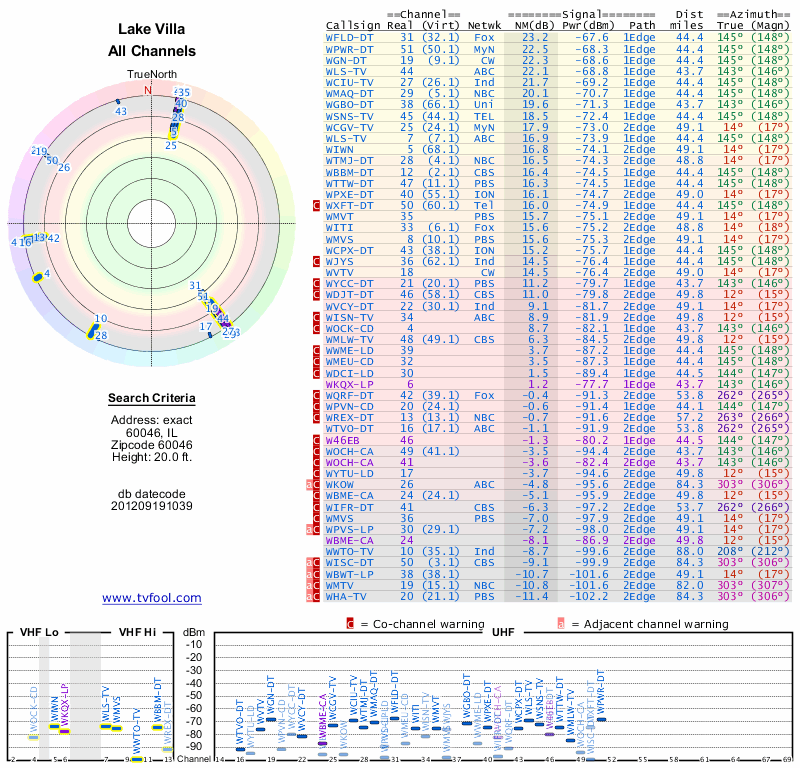 Here are the results for your location. The transmitter database was last updated on June 7, 2013. For more information about these plots and how to interpret them, please check out the Signal Analysis FAQ.