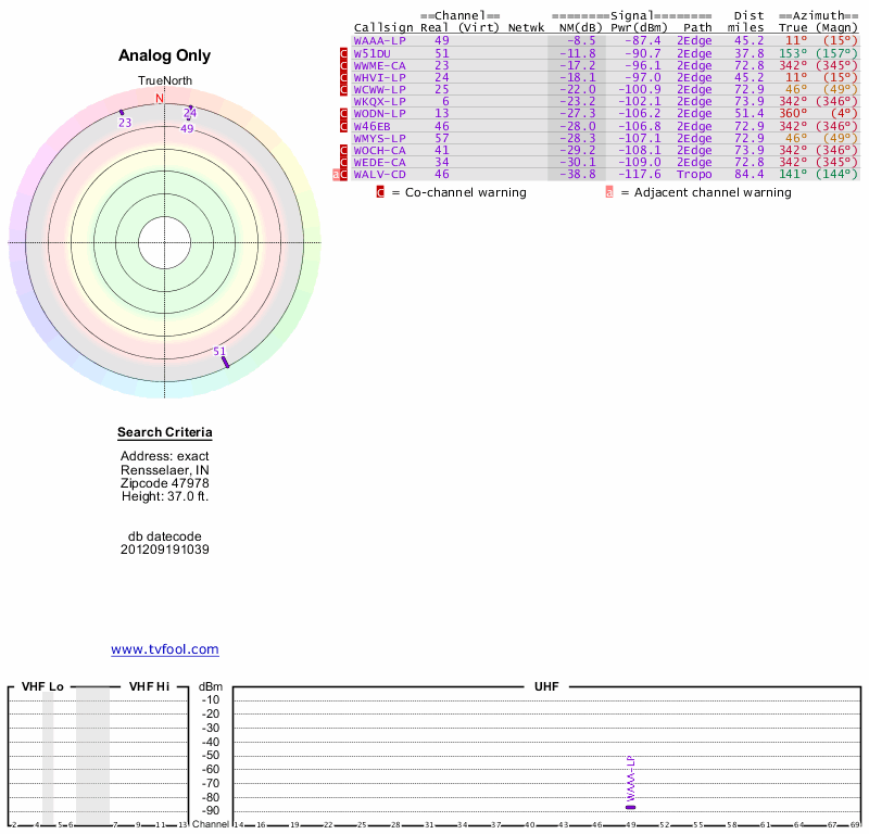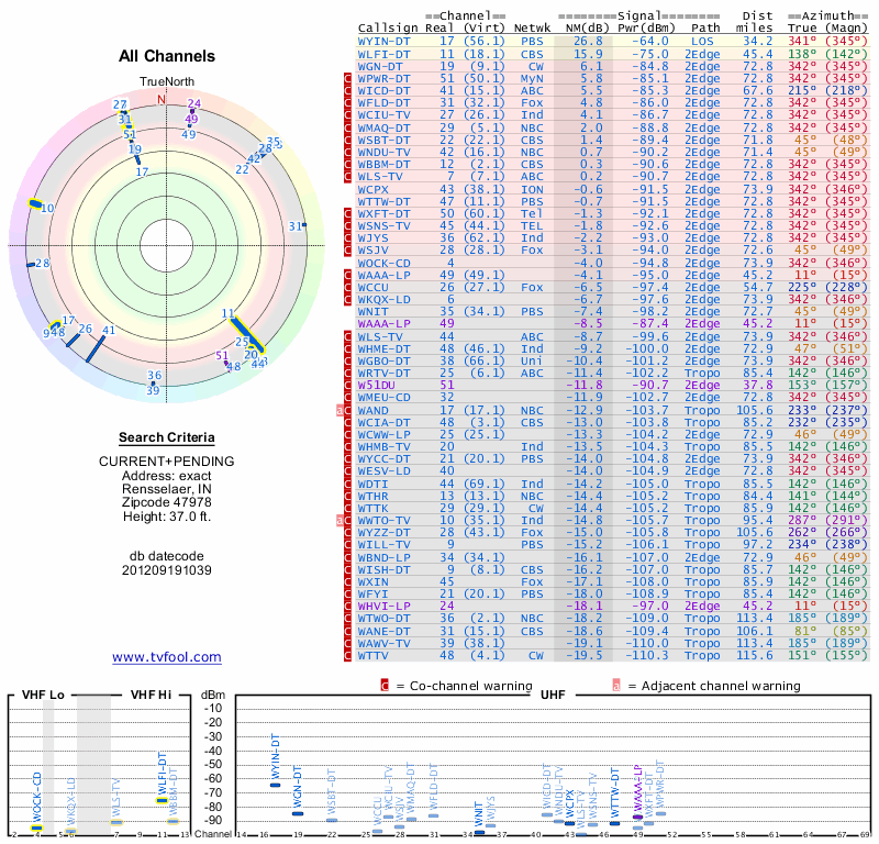 Here are the results for your location. The transmitter database was last updated on June 7, 2013. For more information about these plots and how to interpret them, please check out the Signal Analysis FAQ.
