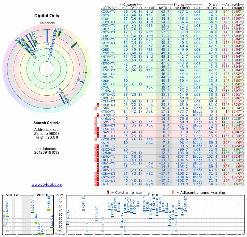 Here are the results for your location. The transmitter database was last updated on June 7, 2013. For more information about these plots and how to interpret them, please check out the Signal Analysis FAQ.