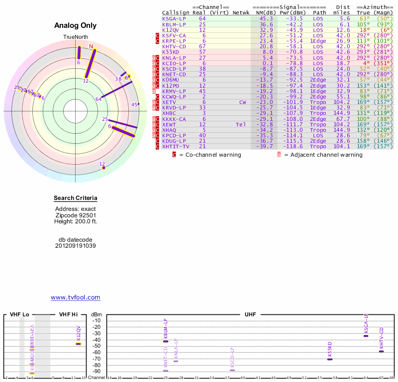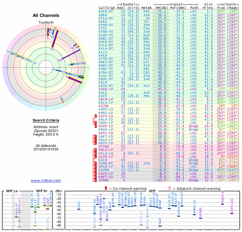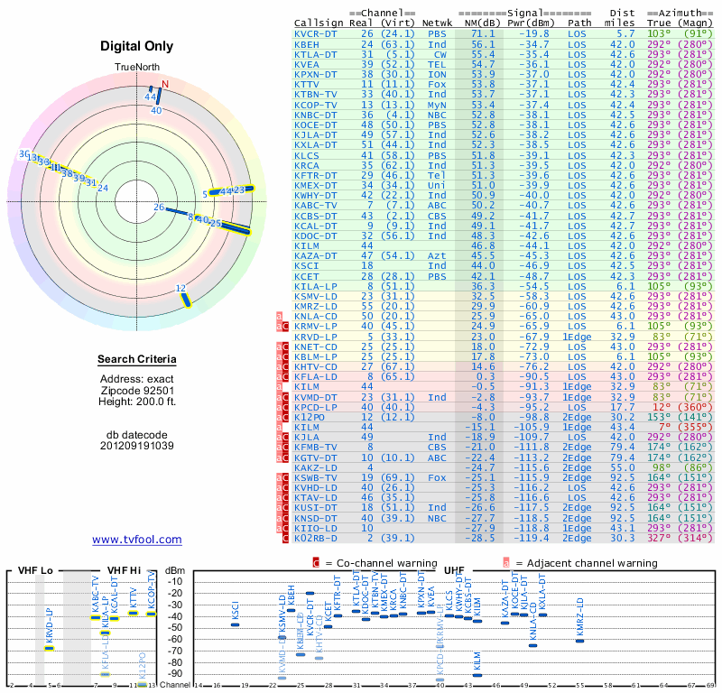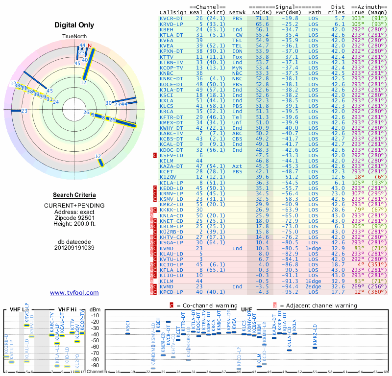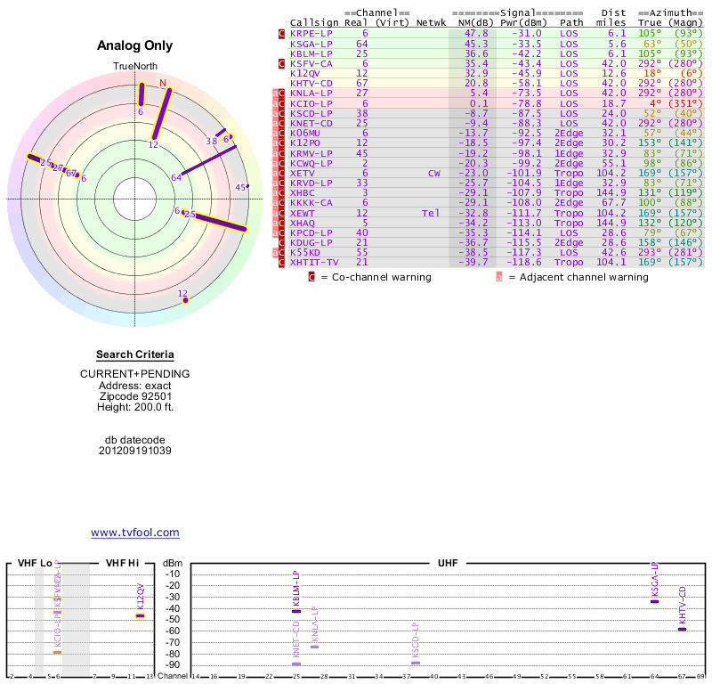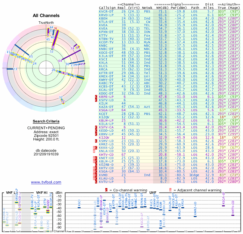 Here are the results for your location. The transmitter database was last updated on June 7, 2013. For more information about these plots and how to interpret them, please check out the Signal Analysis FAQ.