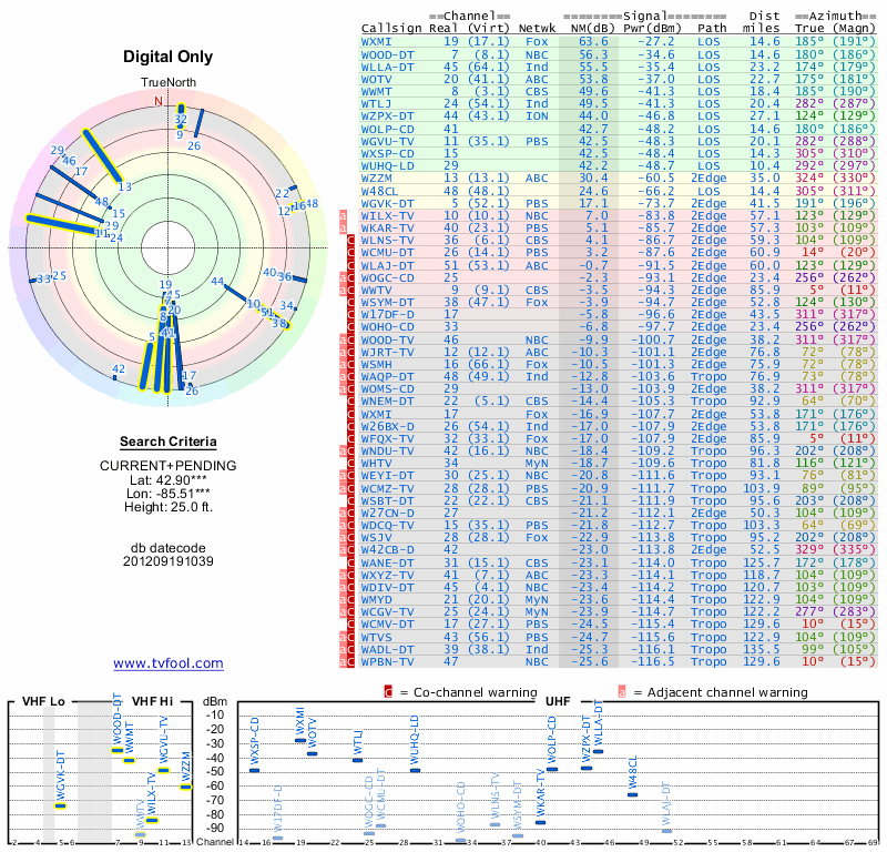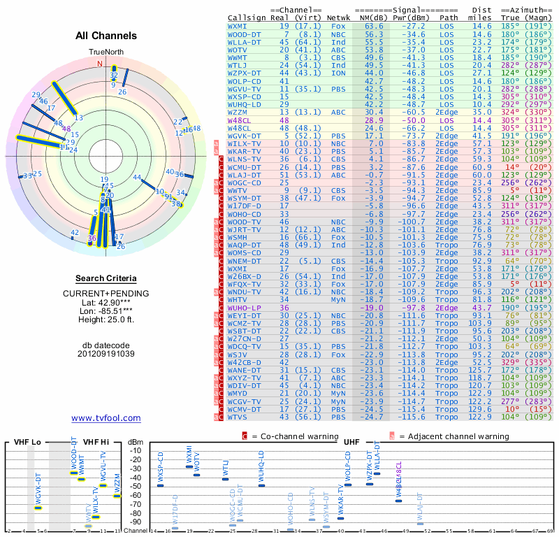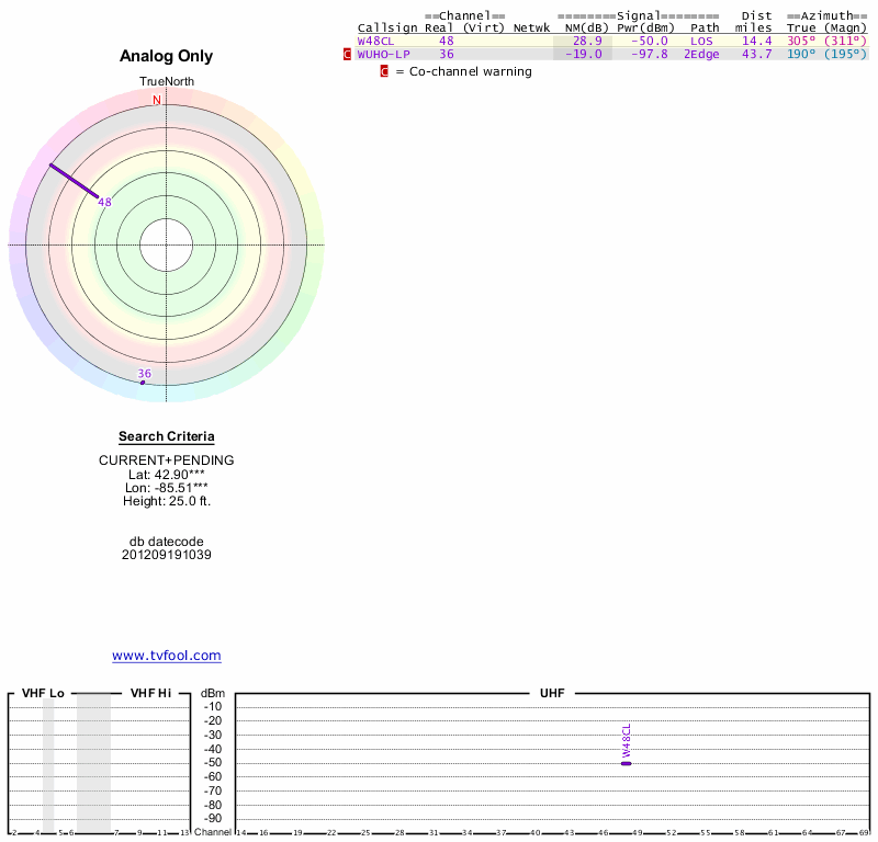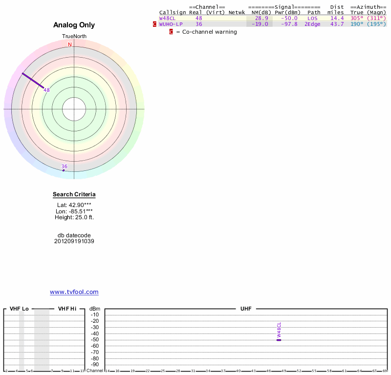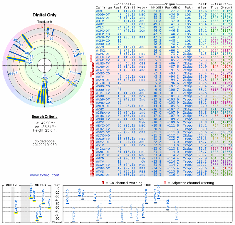 Here are the results for your location. The transmitter database was last updated on June 7, 2013. For more information about these plots and how to interpret them, please check out the Signal Analysis FAQ.