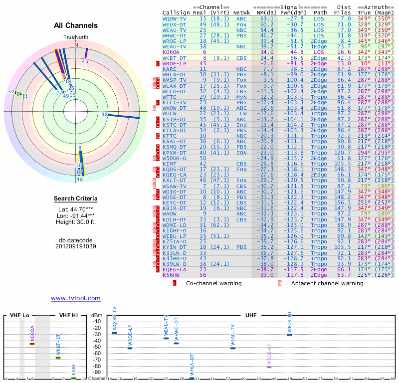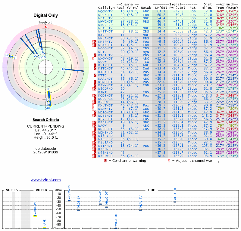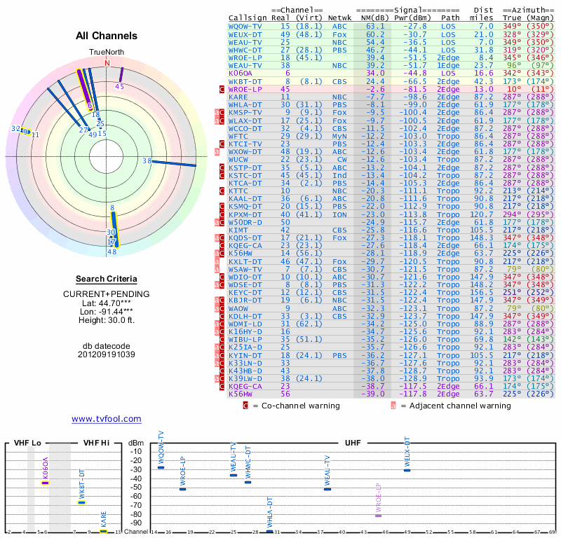 Here are the results for your location. The transmitter database was last updated on June 7, 2013. For more information about these plots and how to interpret them, please check out the Signal Analysis FAQ.