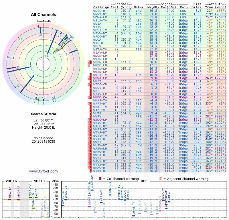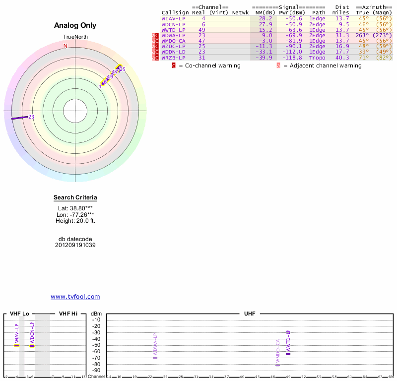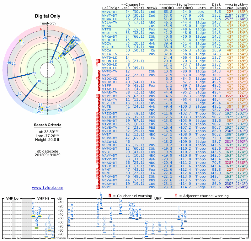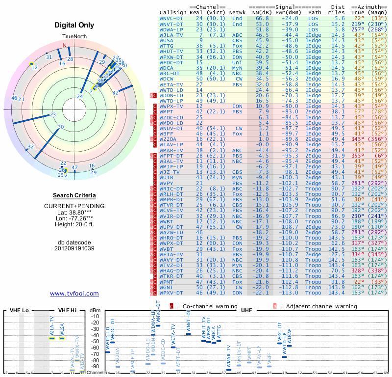 Here are the results for your location. The transmitter database was last updated on June 7, 2013. For more information about these plots and how to interpret them, please check out the Signal Analysis FAQ.