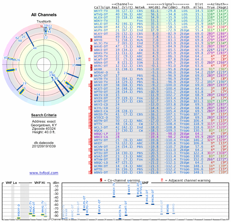 Here are the results for your location. The transmitter database was last updated on June 7, 2013. For more information about these plots and how to interpret them, please check out the Signal Analysis FAQ.