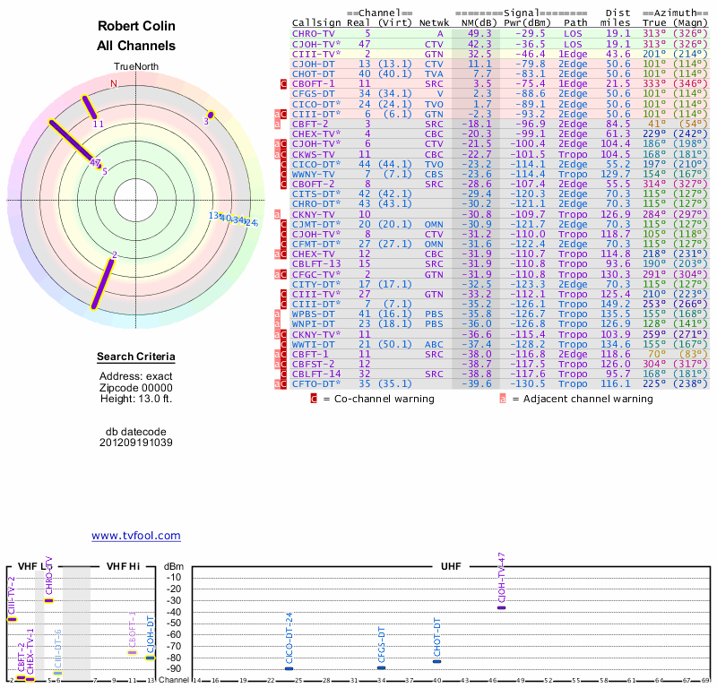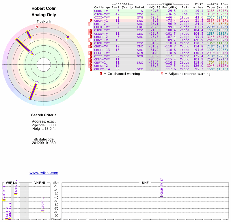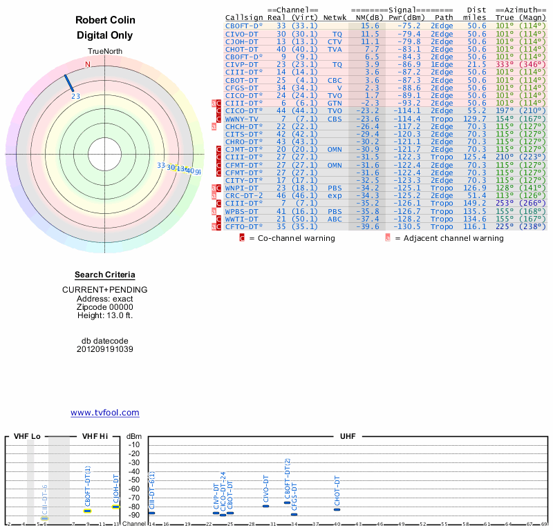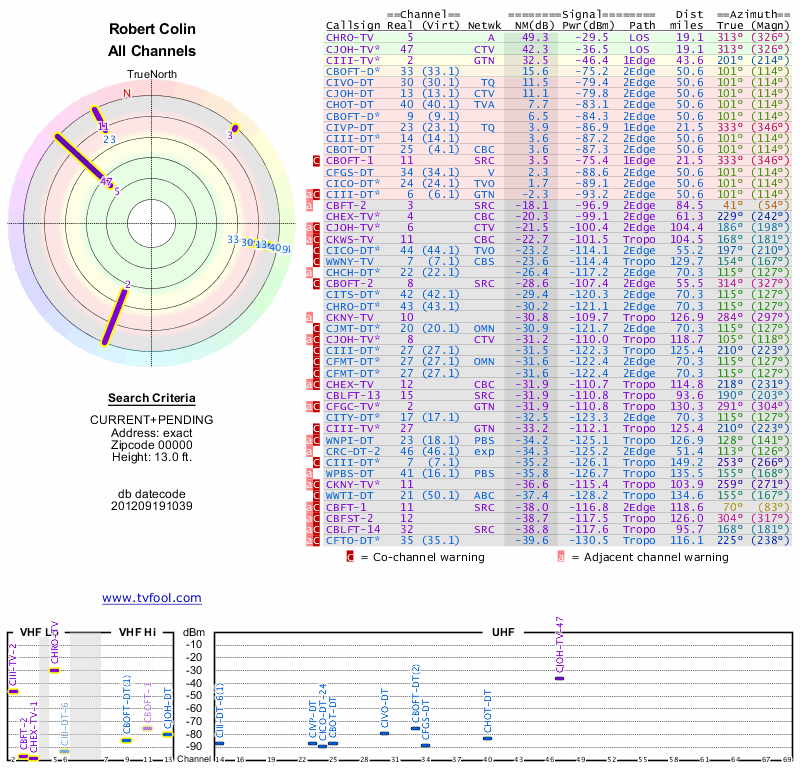 Here are the results for your location. The transmitter database was last updated on June 7, 2013. For more information about these plots and how to interpret them, please check out the Signal Analysis FAQ.