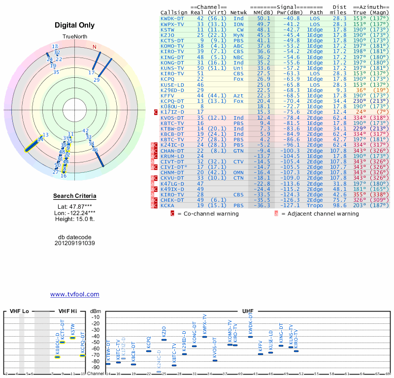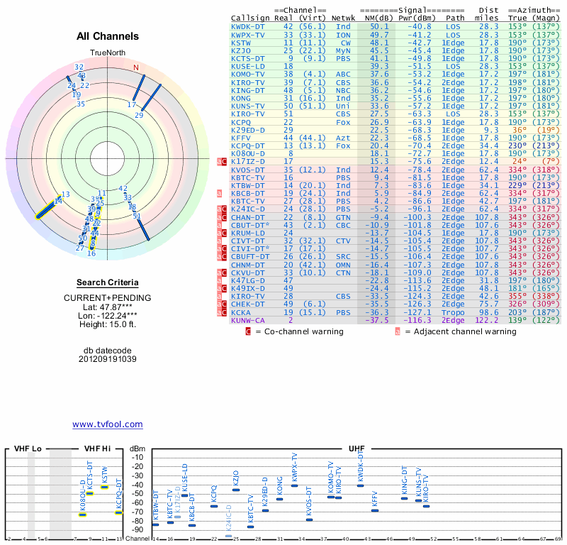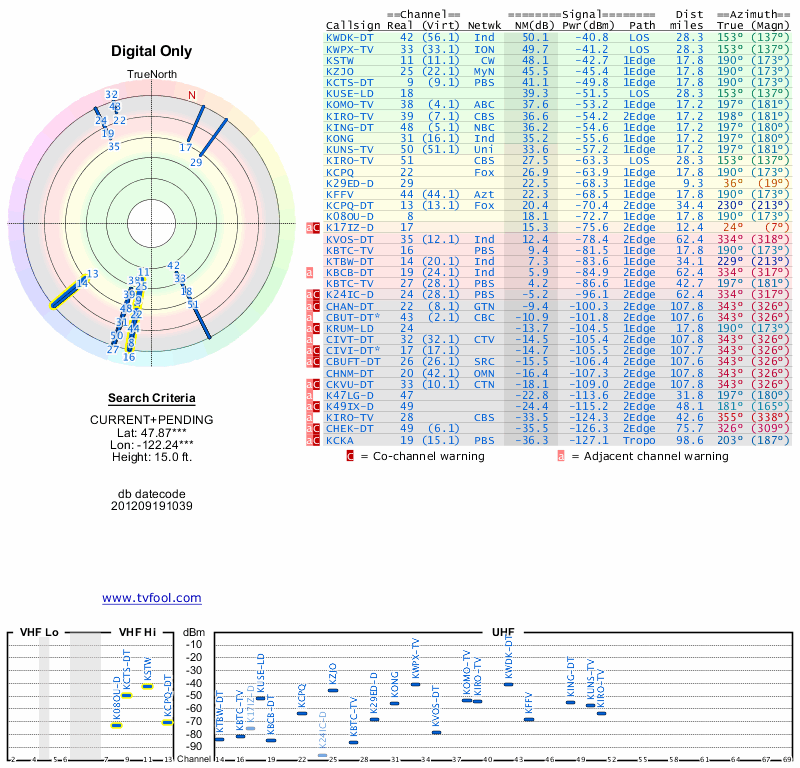Here are the results for your location. The transmitter database was last updated on June 7, 2013. For more information about these plots and how to interpret them, please check out the Signal Analysis FAQ.