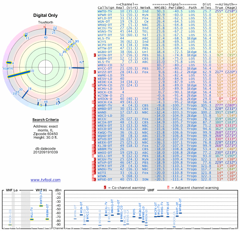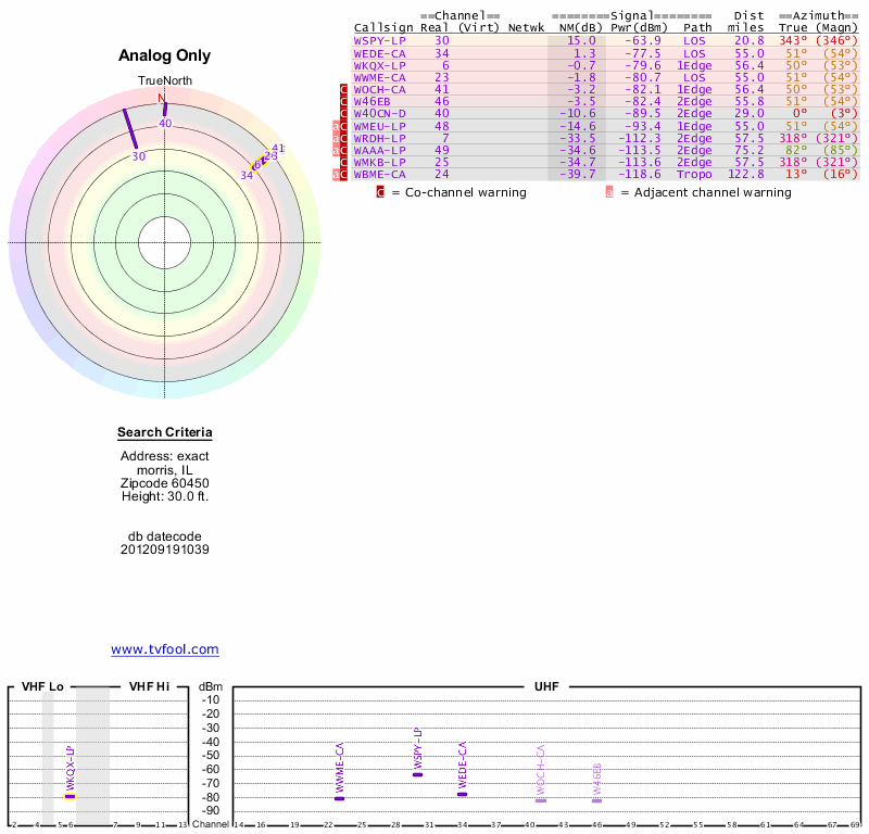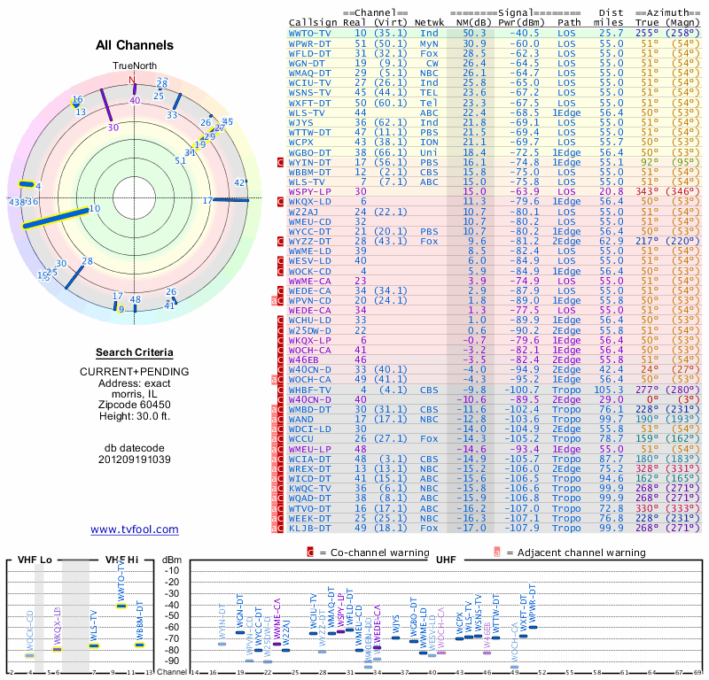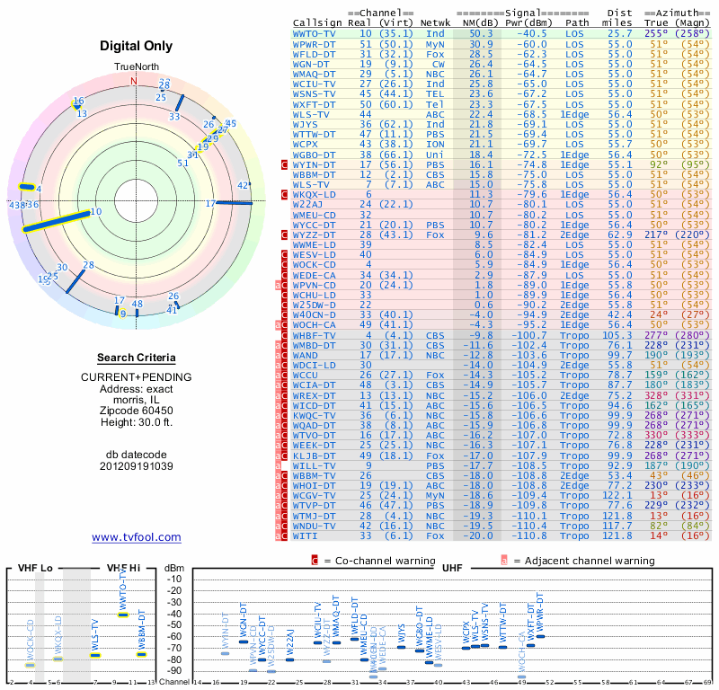 Here are the results for your location. The transmitter database was last updated on June 7, 2013. For more information about these plots and how to interpret them, please check out the Signal Analysis FAQ.