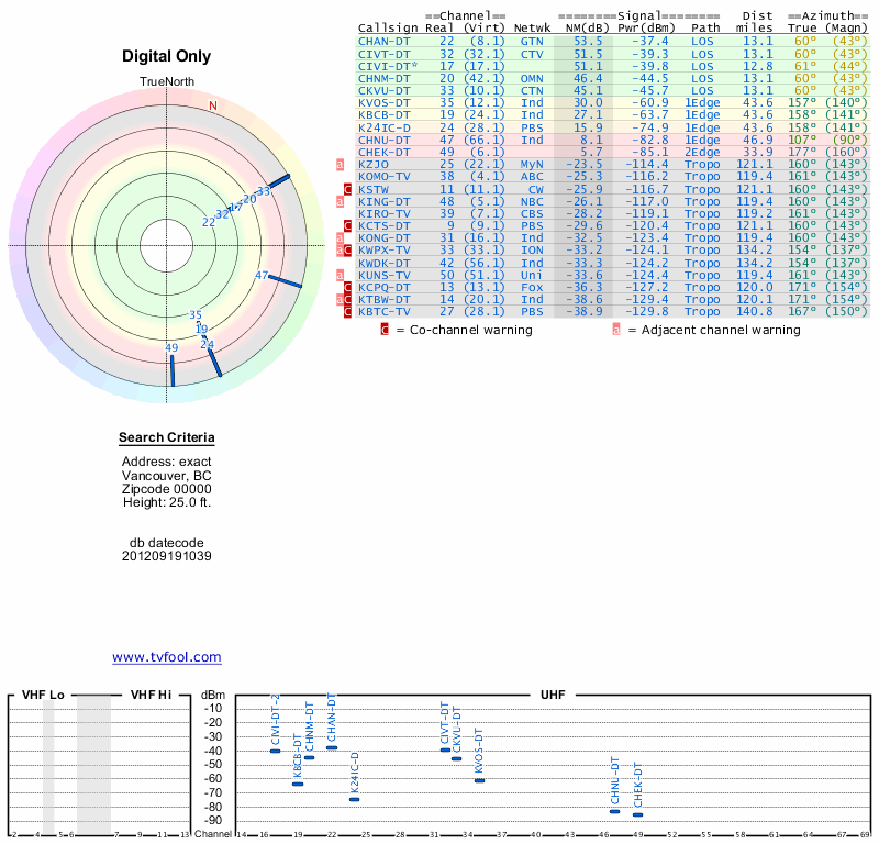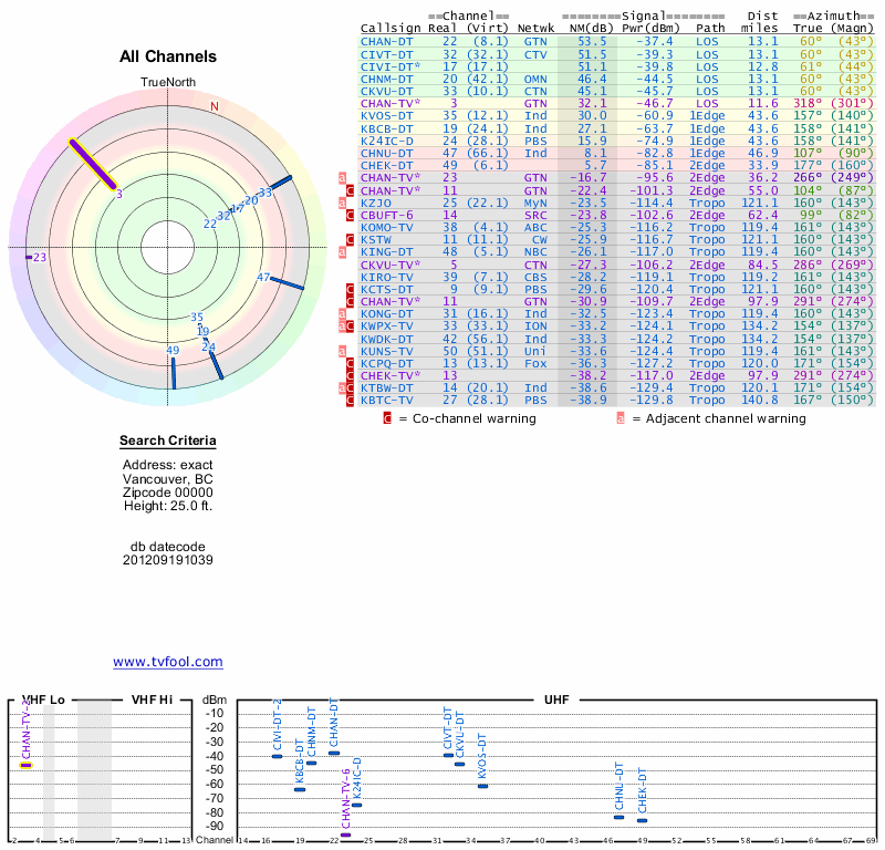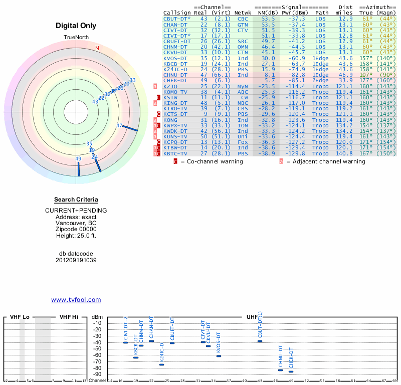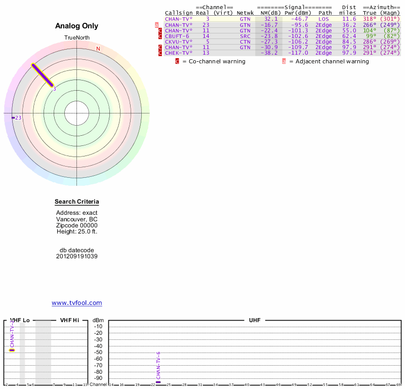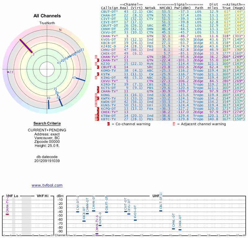 Here are the results for your location. The transmitter database was last updated on June 7, 2013. For more information about these plots and how to interpret them, please check out the Signal Analysis FAQ.