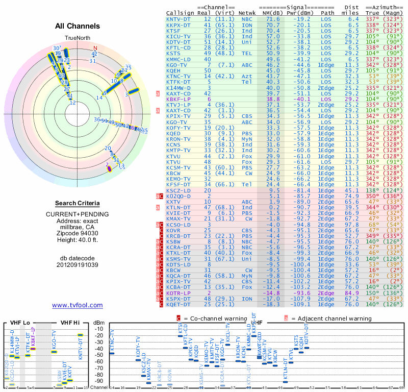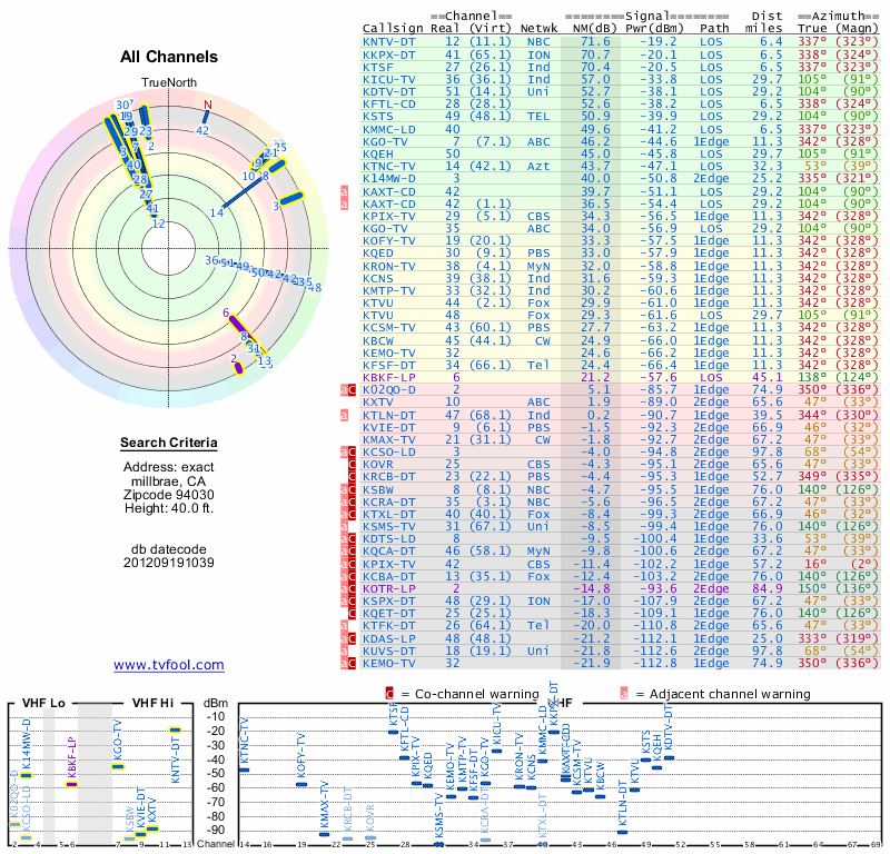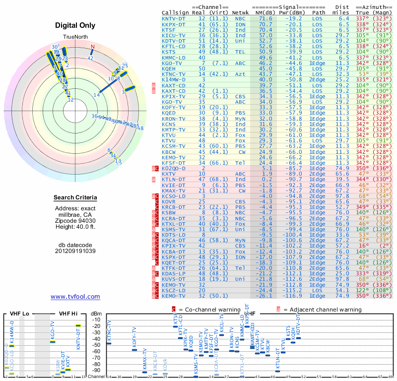 Here are the results for your location. The transmitter database was last updated on June 7, 2013. For more information about these plots and how to interpret them, please check out the Signal Analysis FAQ.