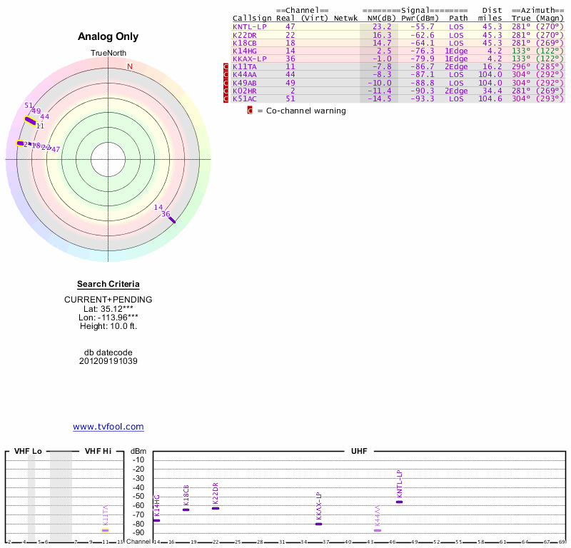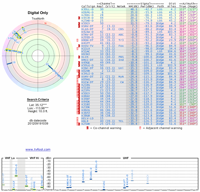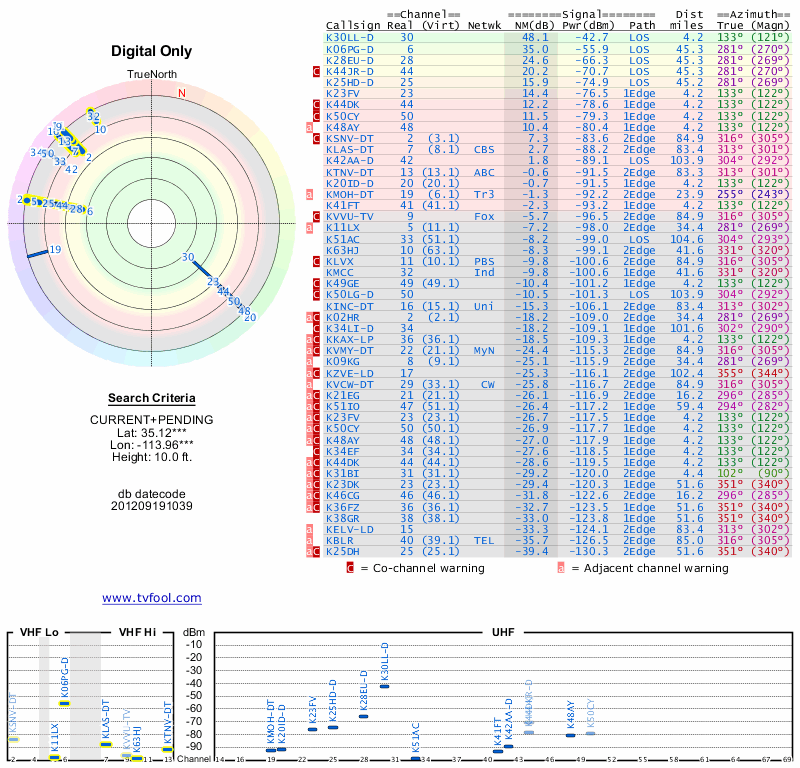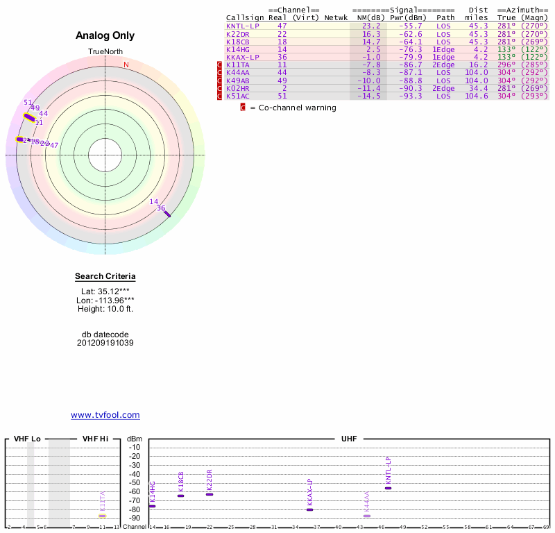 Here are the results for your location. The transmitter database was last updated on June 7, 2013. For more information about these plots and how to interpret them, please check out the Signal Analysis FAQ.