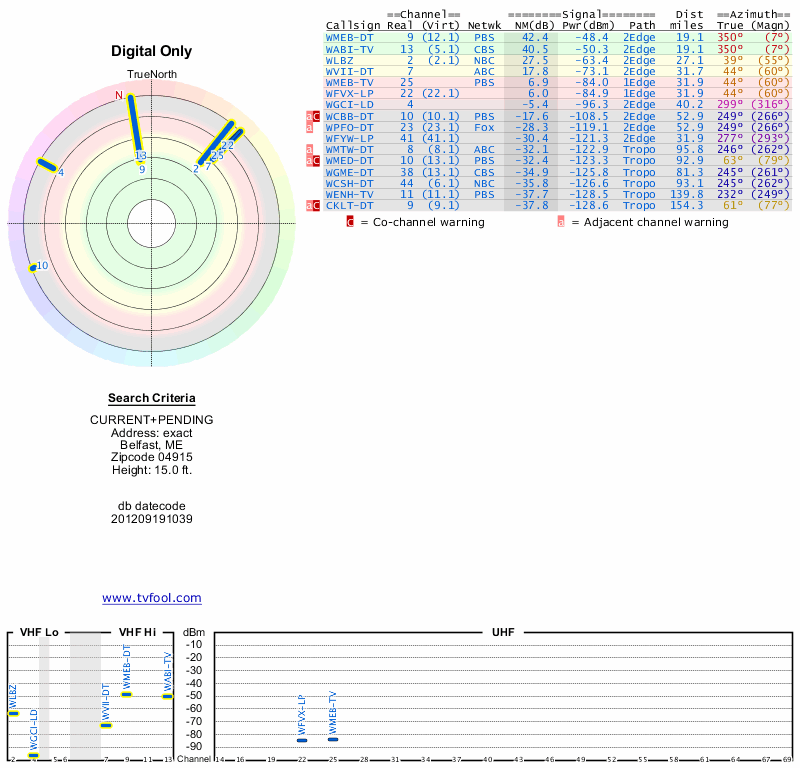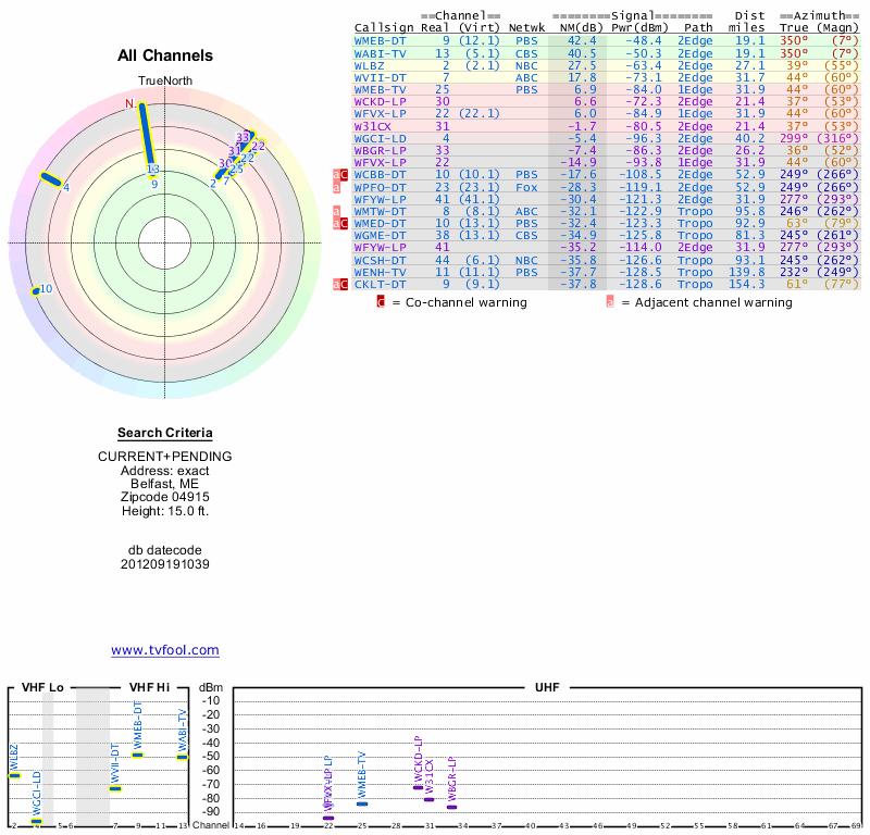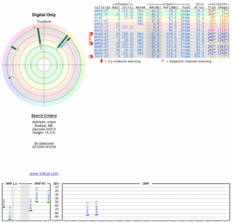 Here are the results for your location. The transmitter database was last updated on June 7, 2013. For more information about these plots and how to interpret them, please check out the Signal Analysis FAQ.