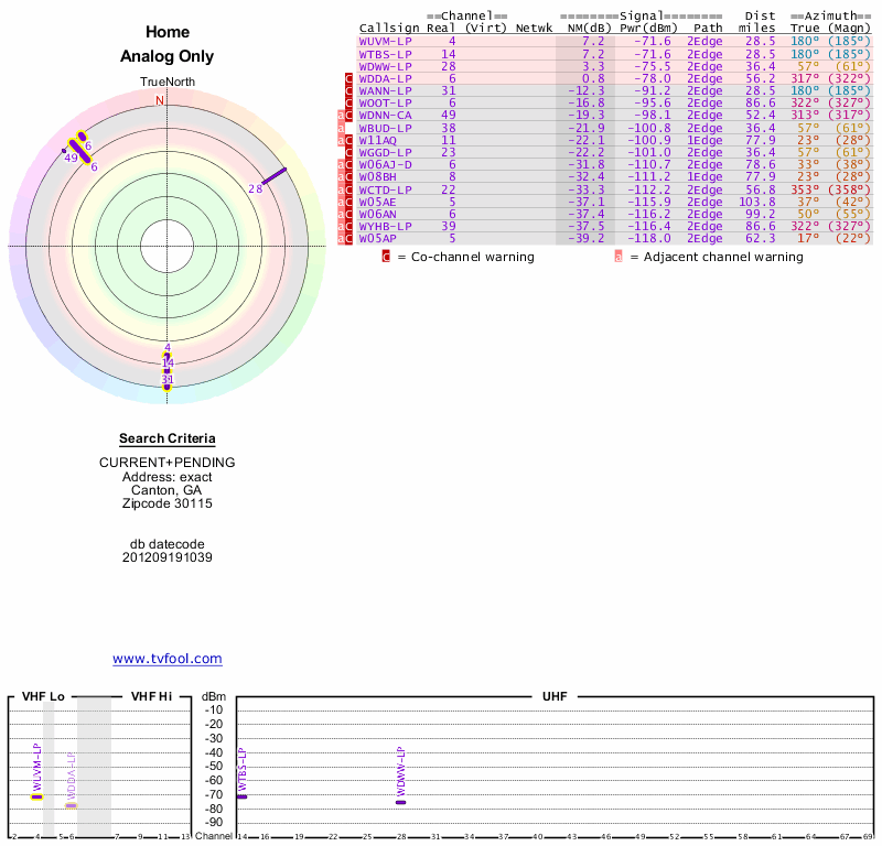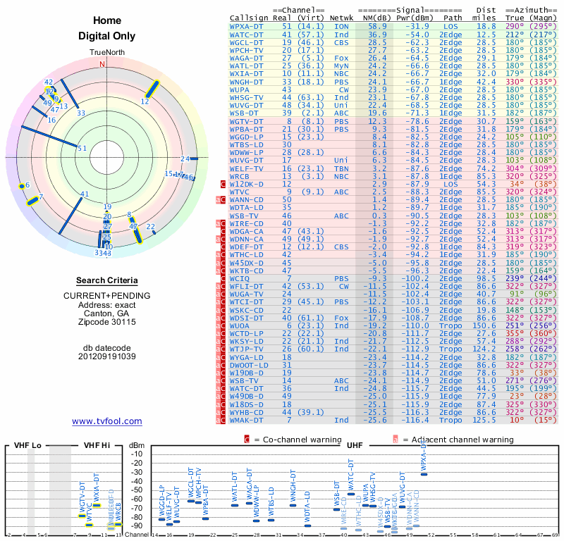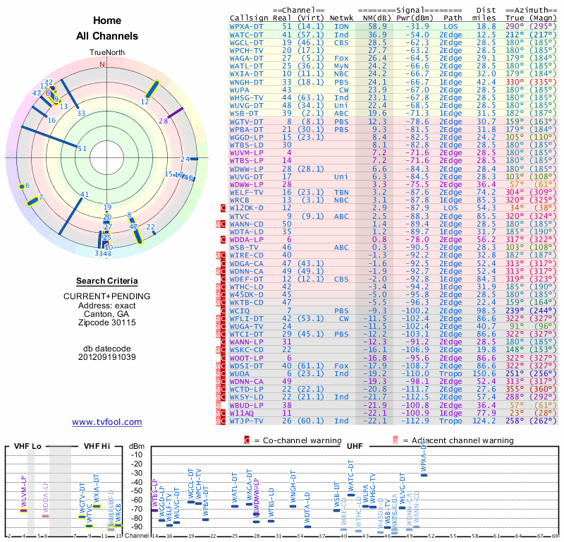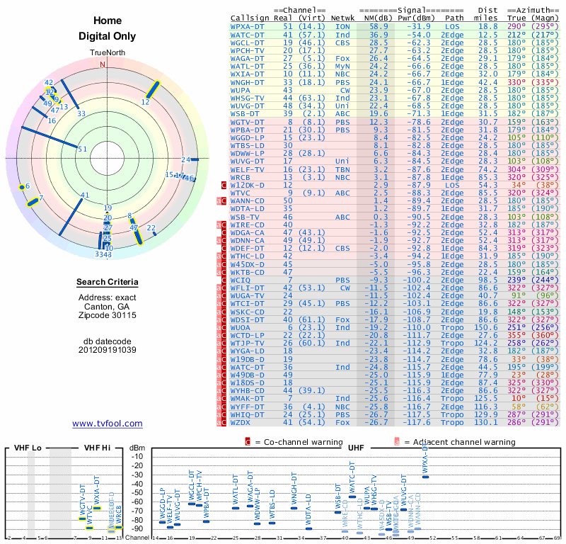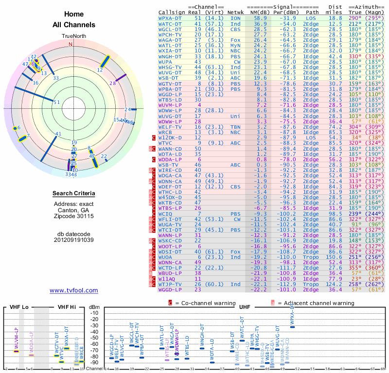 Here are the results for your location. The transmitter database was last updated on June 7, 2013. For more information about these plots and how to interpret them, please check out the Signal Analysis FAQ.