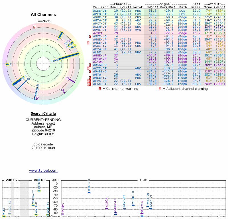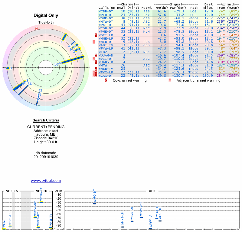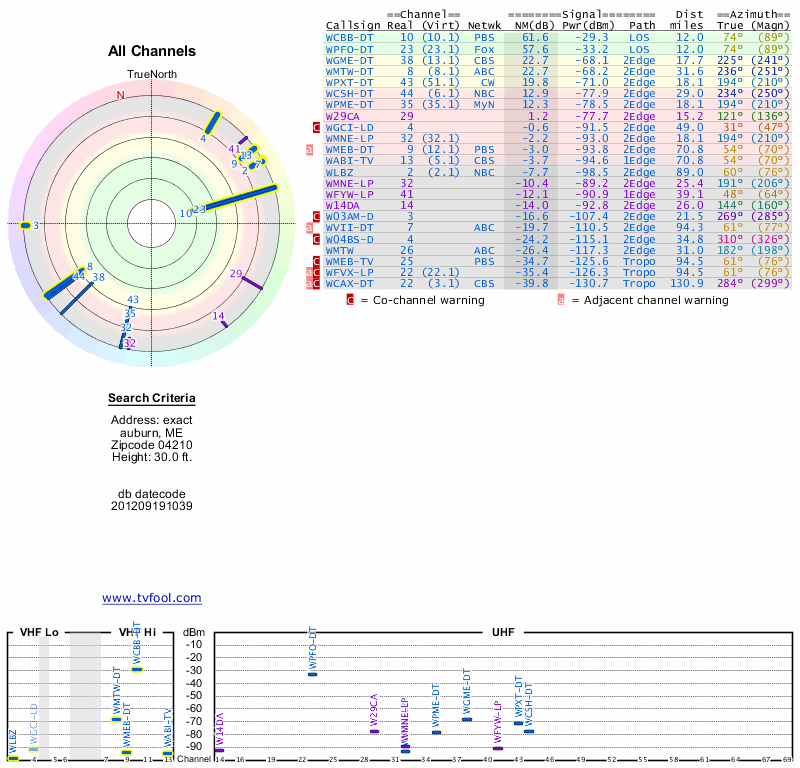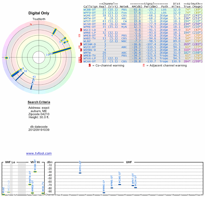 Here are the results for your location. The transmitter database was last updated on June 7, 2013. For more information about these plots and how to interpret them, please check out the Signal Analysis FAQ.
