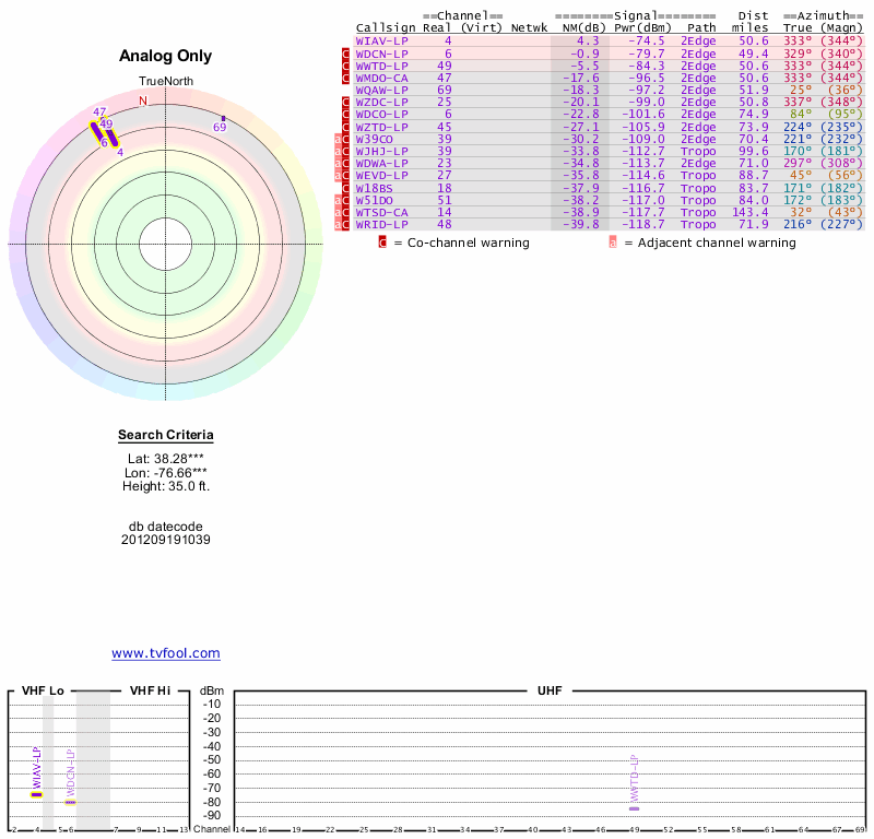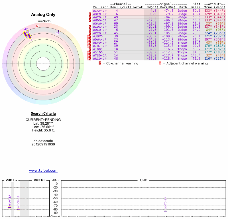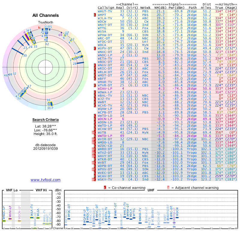 Here are the results for your location. The transmitter database was last updated on June 7, 2013. For more information about these plots and how to interpret them, please check out the Signal Analysis FAQ.