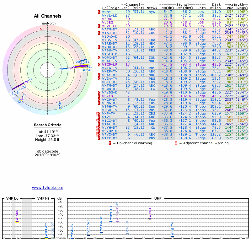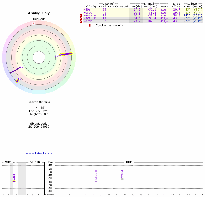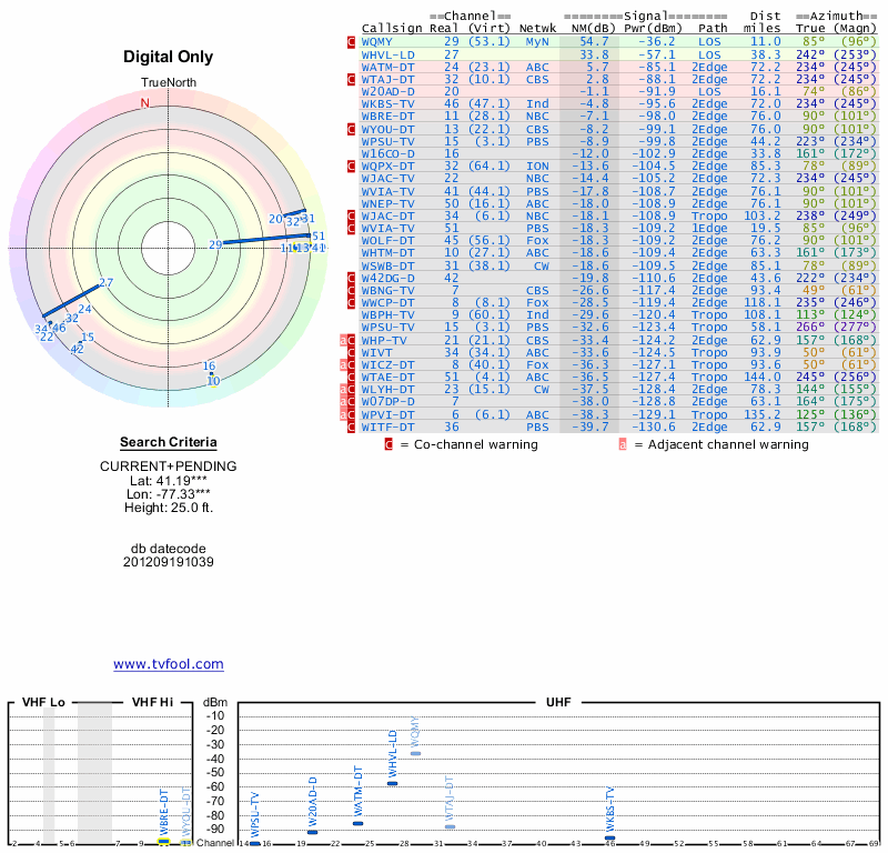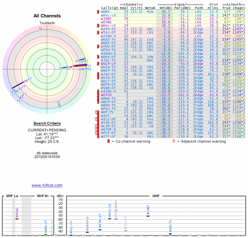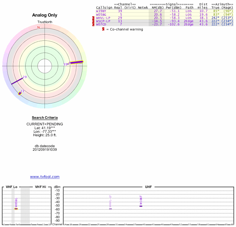 Here are the results for your location. The transmitter database was last updated on June 7, 2013. For more information about these plots and how to interpret them, please check out the Signal Analysis FAQ.