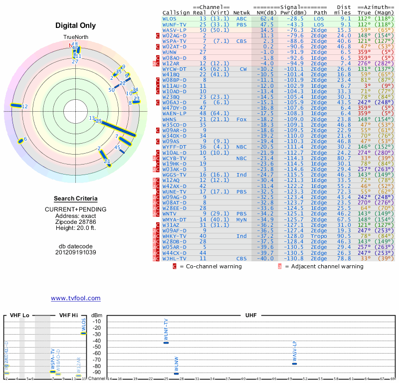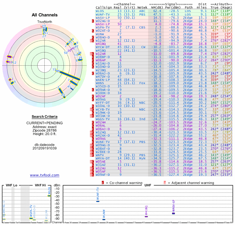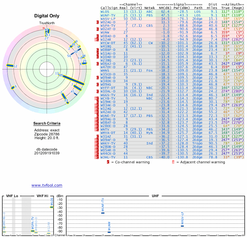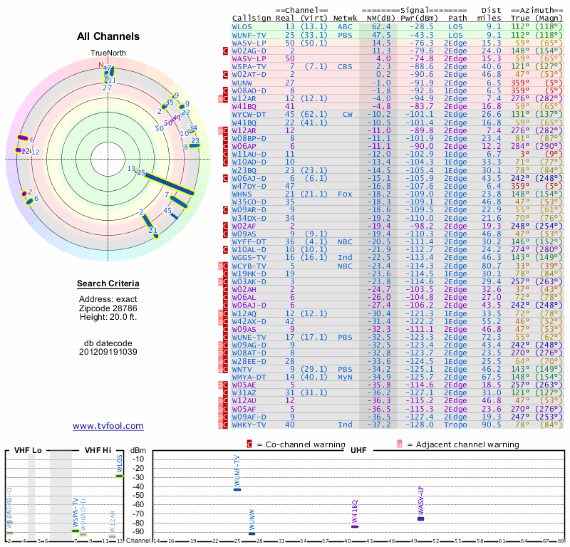 Here are the results for your location. The transmitter database was last updated on June 7, 2013. For more information about these plots and how to interpret them, please check out the Signal Analysis FAQ.
