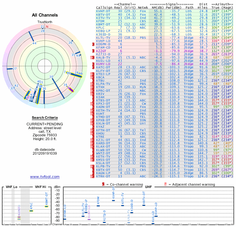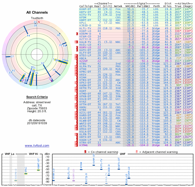Here are the results for your location. The transmitter database was last updated on June 7, 2013. For more information about these plots and how to interpret them, please check out the Signal Analysis FAQ.