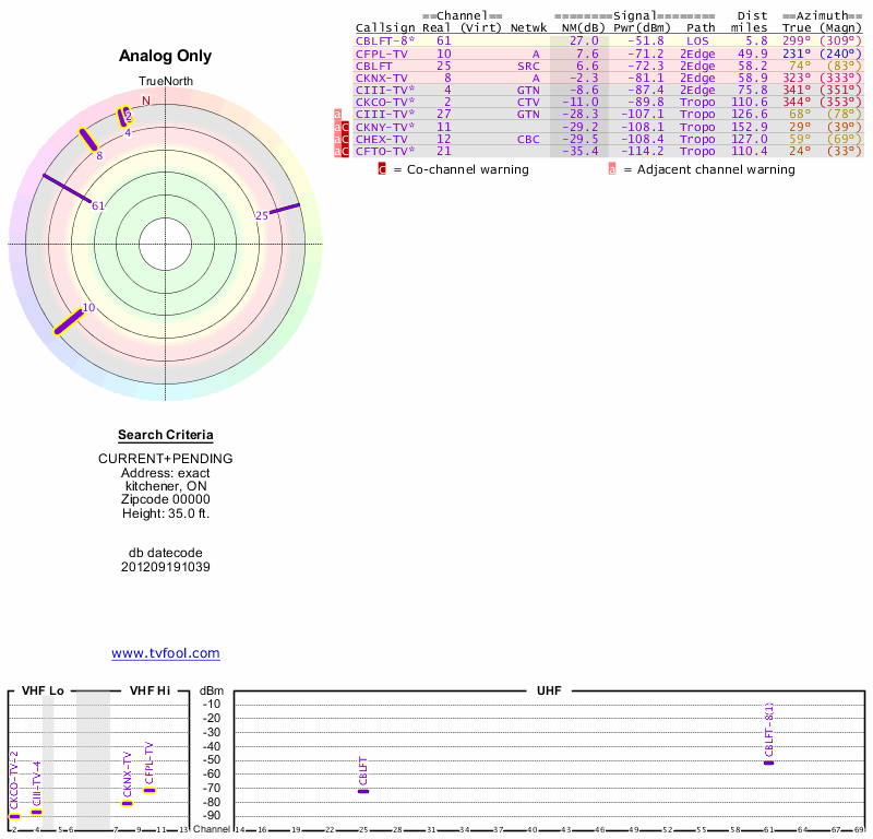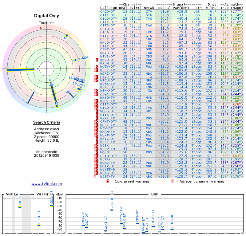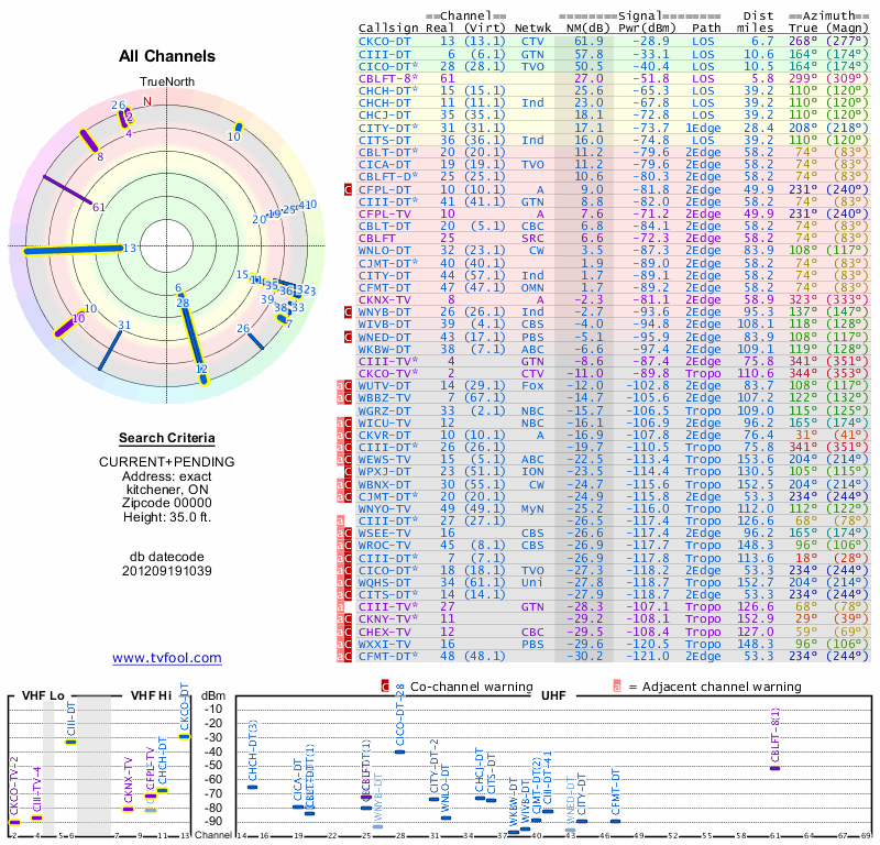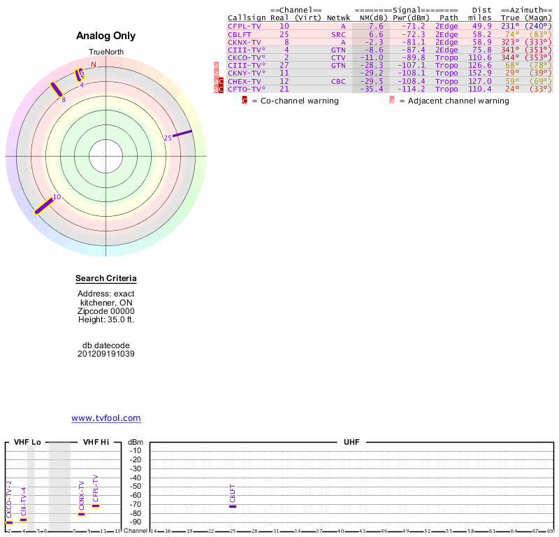 Here are the results for your location. The transmitter database was last updated on June 7, 2013. For more information about these plots and how to interpret them, please check out the Signal Analysis FAQ.